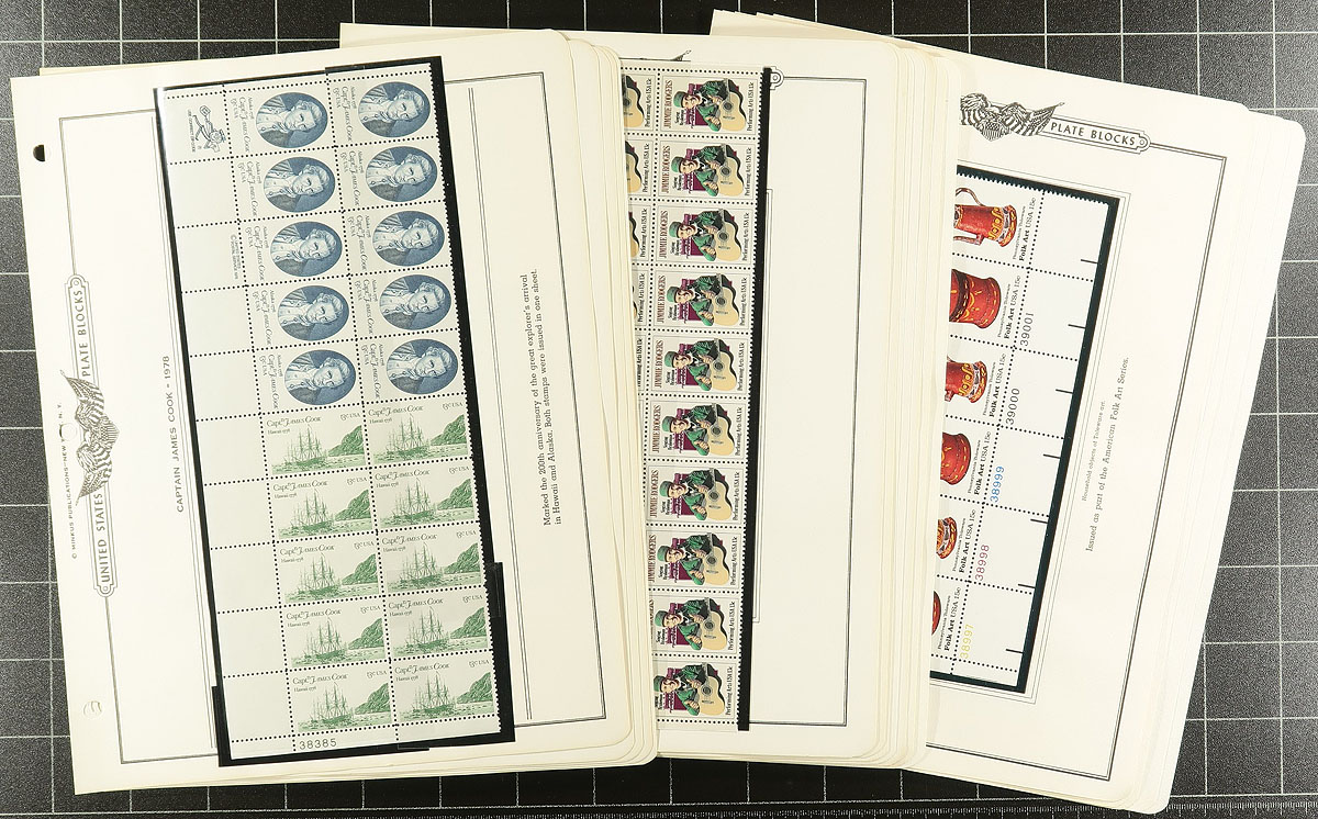Large collection / accumulation of never hinged United States plate blocks, 1940's-1980, containing several hundred of plate blocks (many in larger blocks and multiples). The lot generally ranges from Scott #943/1841 in two formats, noting a few hundred in hingeless album pages (from 1974 to 1980), and many hundred in individual glassines. Catalogue value would be several hundred dollars, with face value alone just over US$200.00 A nice clean lot for all collectors. Estimate =