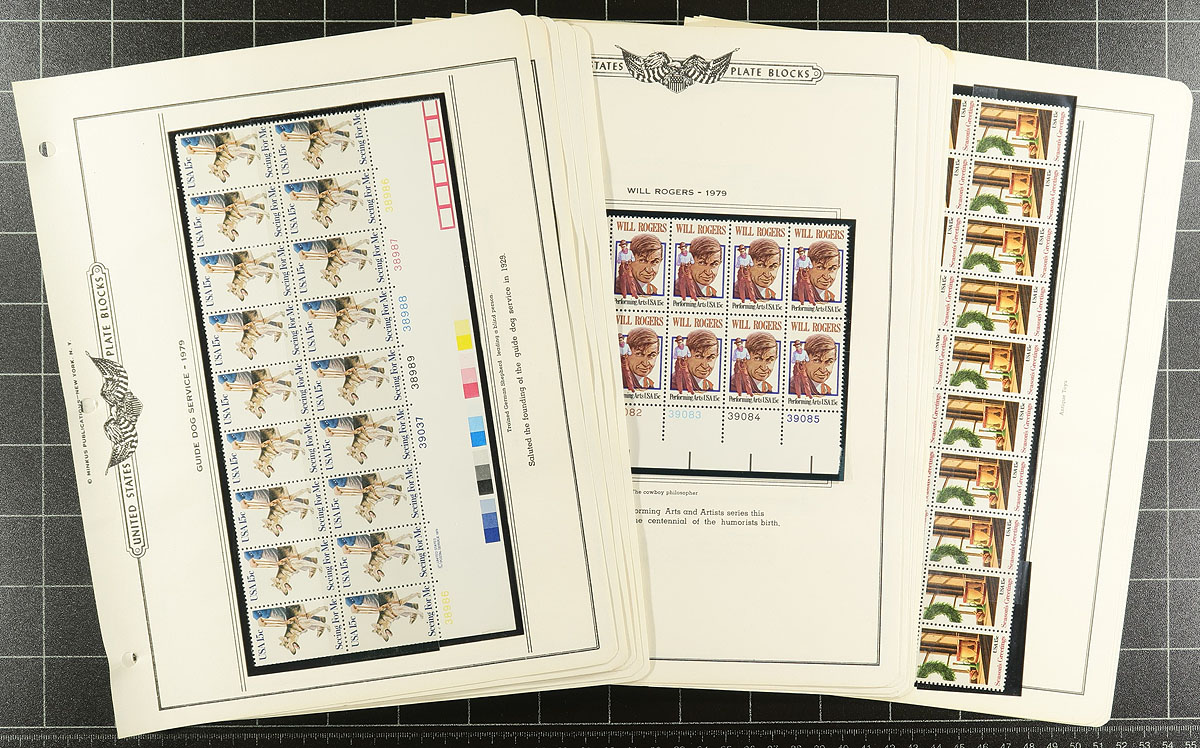 Large collection / accumulation of never hinged United States plate blocks, 1940's-1980, containing several hundred of plate blocks (many in larger blocks and multiples). The lot generally ranges from Scott #943/1841 in two formats, noting a few hundred in hingeless album pages (from 1974 to 1980), and many hundred in individual glassines. Catalogue value would be several hundred dollars, with face value alone just over US$200.00 A nice clean lot for all collectors. Estimate =