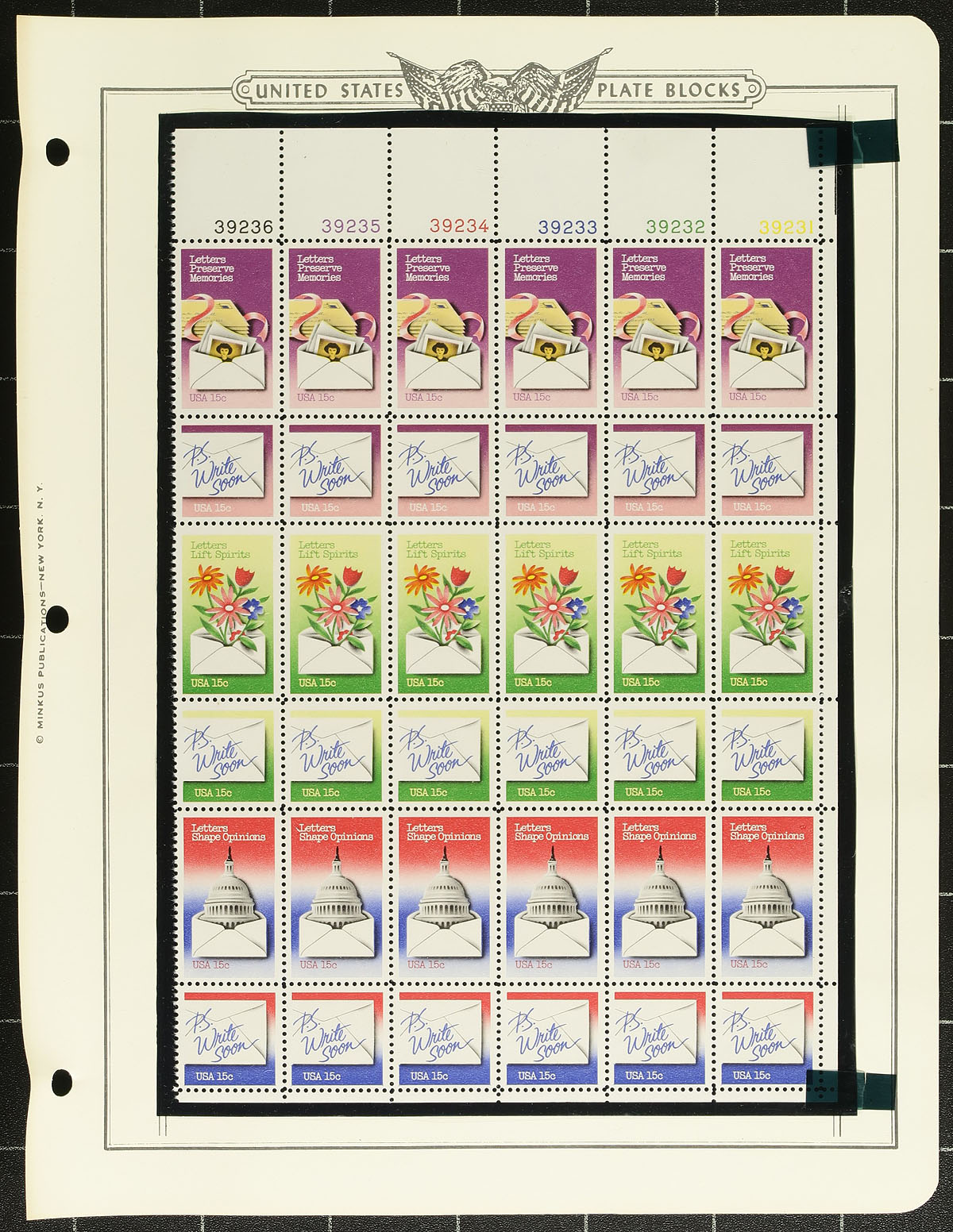 Large collection / accumulation of never hinged United States plate blocks, 1940's-1980, containing several hundred of plate blocks (many in larger blocks and multiples). The lot generally ranges from Scott #943/1841 in two formats, noting a few hundred in hingeless album pages (from 1974 to 1980), and many hundred in individual glassines. Catalogue value would be several hundred dollars, with face value alone just over US$200.00 A nice clean lot for all collectors. Estimate =