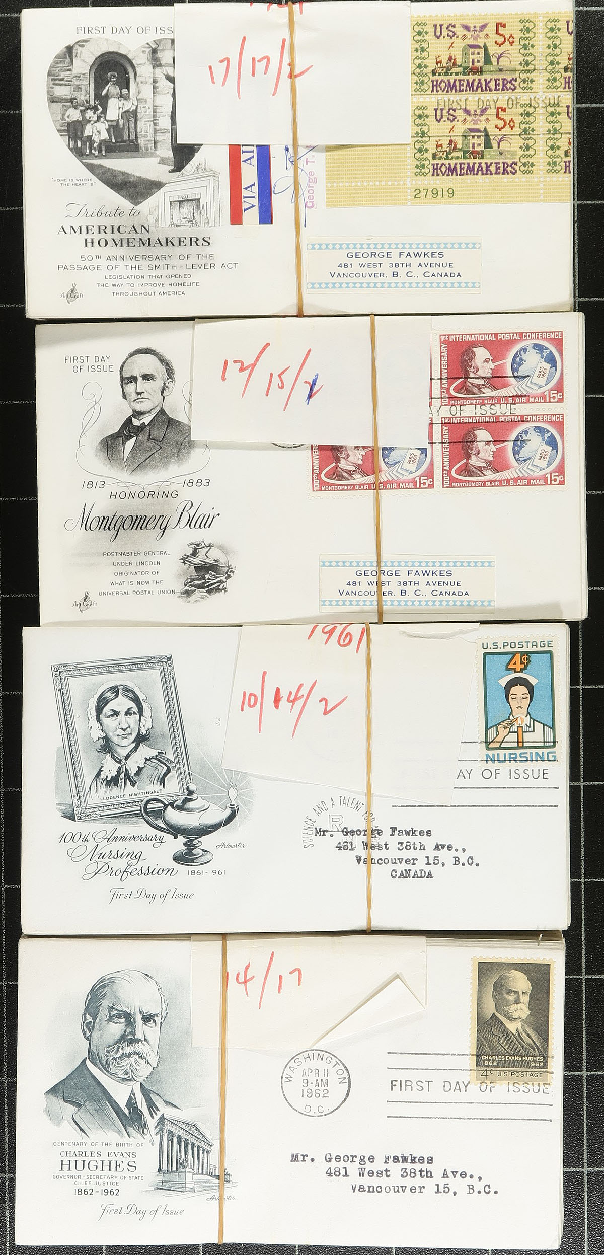 Collection of roughly 500 United States first day covers, 1950-1967, neatly organized by year in a shoebox. We note single, pair, and block frankings (all 3 for some issues), all appearing to have private cachets (some in color), from a few designers at Cachetcraft, along with Artmaster cachets. A few small corner bends on a few covers, overall a nice group. Estimate =