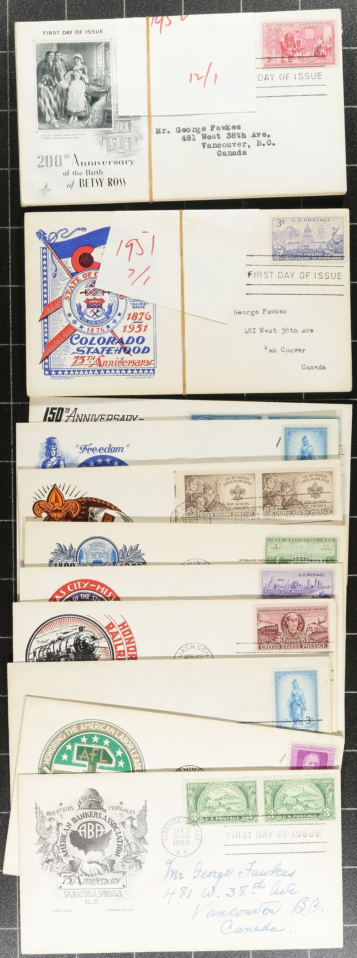 Collection of roughly 500 United States first day covers, 1950-1967, neatly organized by year in a shoebox. We note single, pair, and block frankings (all 3 for some issues), all appearing to have private cachets (some in color), from a few designers at Cachetcraft, along with Artmaster cachets. A few small corner bends on a few covers, overall a nice group. Estimate =