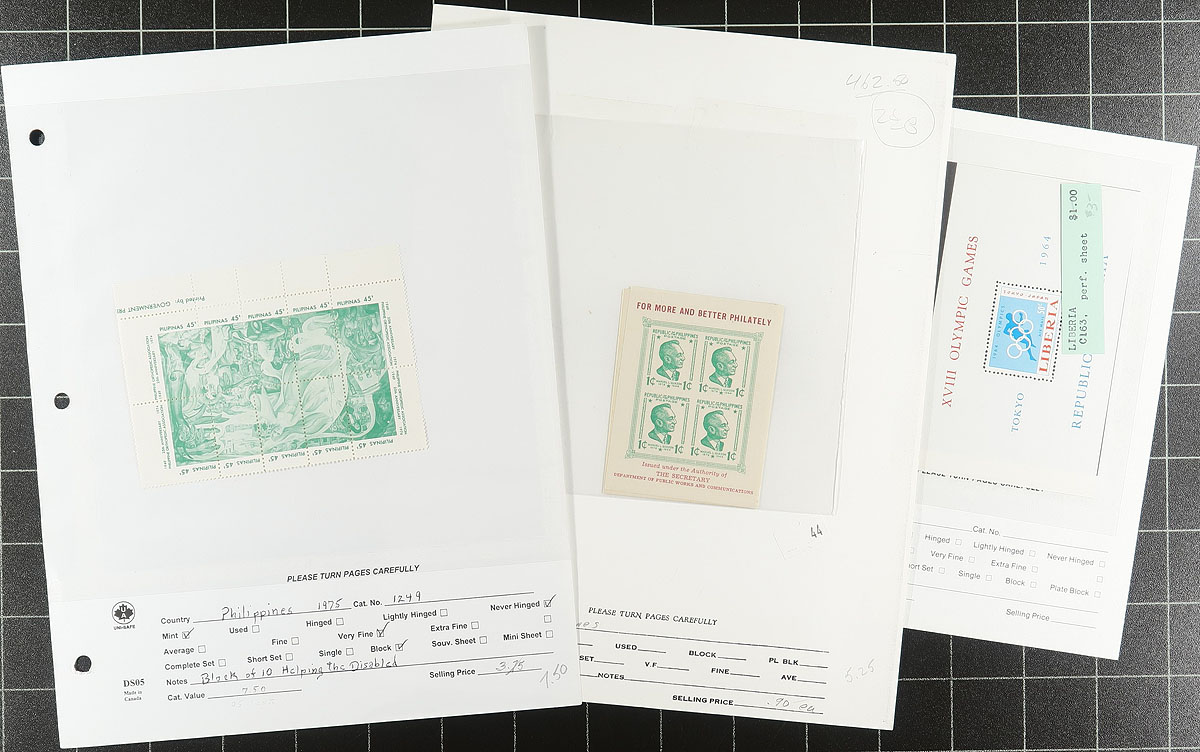 Attractive accumulation of roughly 250 primarily never hinged worldwide souvenir sheets, mostly with an Asia flavour with better representation from Korea (including some North Korea with CTO cancels), along with Philippines, Liberia, and more. The material generally ranges from the 1970's to the 1990's, with material possible on either side of the given range, with a spot check indicating a few sheets cataloguing $10 and up. A nice lot for thematic and topical collectors as we note many suitable subjects including nature, transportation, sports, scouts, and more. Estimate =