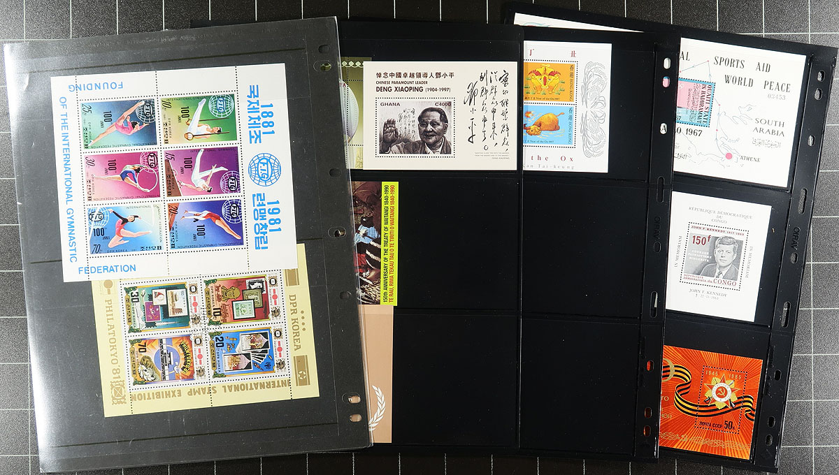 Attractive accumulation of roughly 250 primarily never hinged worldwide souvenir sheets, mostly with an Asia flavour with better representation from Korea (including some North Korea with CTO cancels), along with Philippines, Liberia, and more. The material generally ranges from the 1970's to the 1990's, with material possible on either side of the given range, with a spot check indicating a few sheets cataloguing $10 and up. A nice lot for thematic and topical collectors as we note many suitable subjects including nature, transportation, sports, scouts, and more. Estimate =
