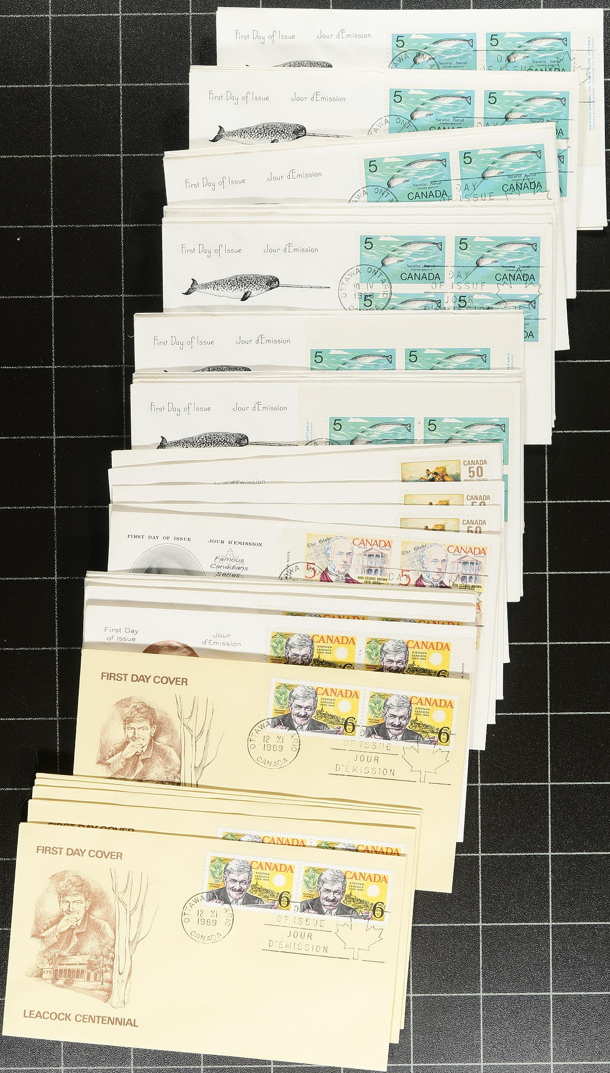 First Day Covers. Accumulation of roughly 900 private cachet Canada first day covers, appearing to be all from the mid 1960's to 1971. We note singles, pairs, blocks, and or plate block frankings, with roughly 5 to 10 covers per issue. Private cachet makers include Capital, Rosecraft, and Cole, with some issues having a variety of cachets. A few covers have a few faults, but overall a nice lot for the first day cover collector. Estimate =