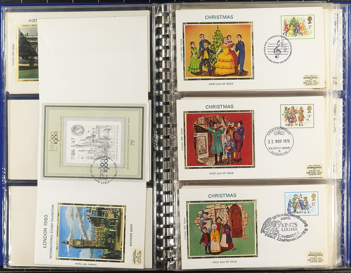 Collection of roughly 250 Great Britain first day covers, 1970's-2000, in two Royal Mail First Day Cover albums, and two other albums. The collection consists of roughly 125 Colorado Silk cachet first day covers in two albums, ranging from 1976-1981, with the remaining first day covers containing mostly sets frankings from the 1980's to 2000. A nice clean lot for collectors and dealers alike. Estimate =