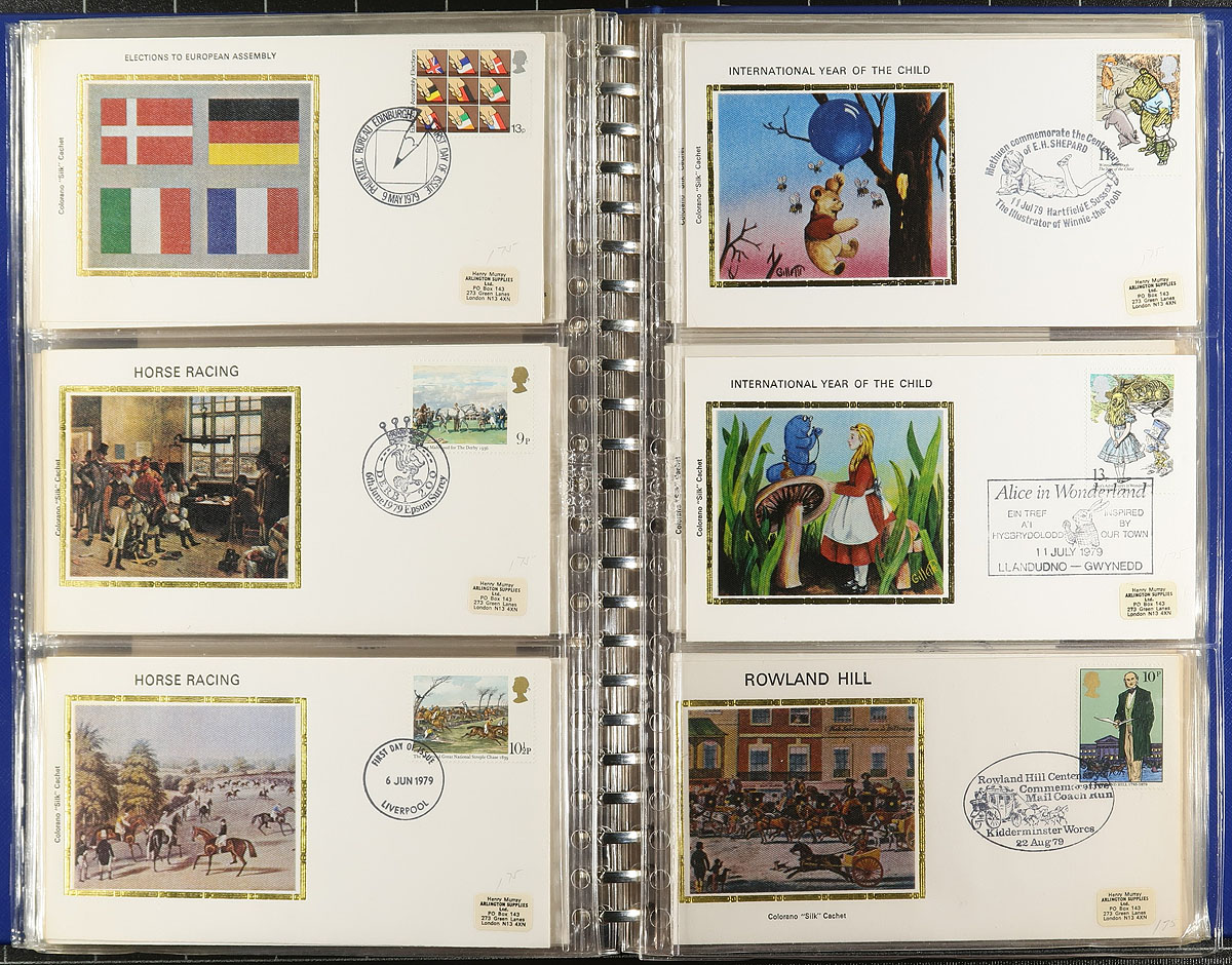 Collection of roughly 250 Great Britain first day covers, 1970's-2000, in two Royal Mail First Day Cover albums, and two other albums. The collection consists of roughly 125 Colorado Silk cachet first day covers in two albums, ranging from 1976-1981, with the remaining first day covers containing mostly sets frankings from the 1980's to 2000. A nice clean lot for collectors and dealers alike. Estimate =