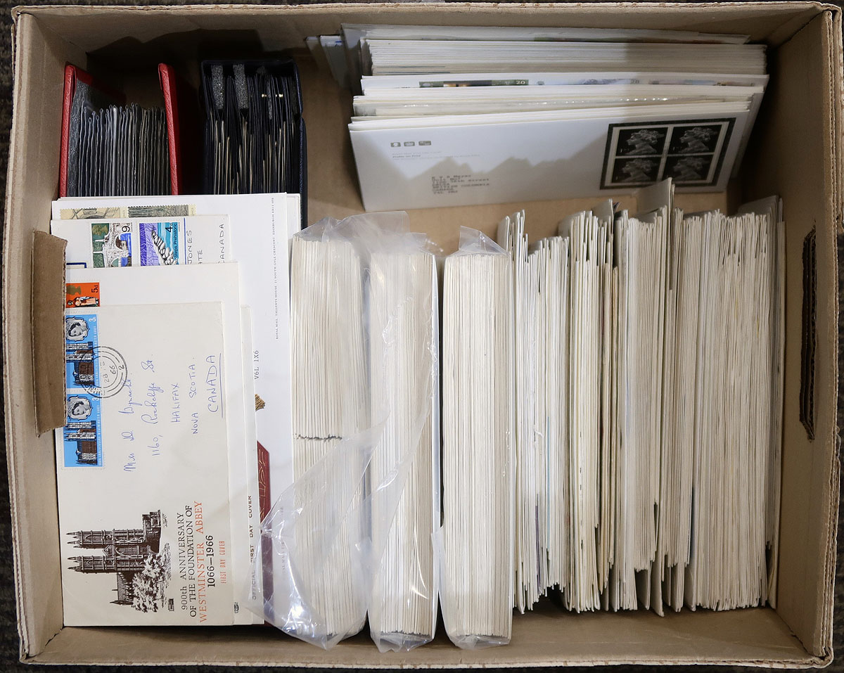 Accumulation of roughly 600 Great Britain first day covers filling a bankers box, 1960's-2000's, includes roughly 300 Fleetwood cachet covers in 3 large packs, Herm Island covers, Regionals, etc. Many of the covers have set frankings, along with singles, booklet pane, and souvenir sheets. Some minor duplication possible, with a few covers having small corner bends. A nice lot for collectors and dealers alike. Estimate =