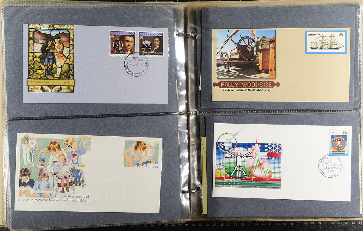 Collection of roughly 375 primarily Australia first day covers, 1970's-2000's, in plastic sleeves housed in three full binders. The lot generally consists of first day covers, some cacheted and some unaddressed, with singles, sets, and souvenir sheet frankings. The collection also includes postal stationery and air letter (both unused and or with first day cancels), along with a few items from Australian Antarctic Territory. A few covers have been priced ranging from $3 to $20 and up each. A nice lot for the Australia collector. Estimate =