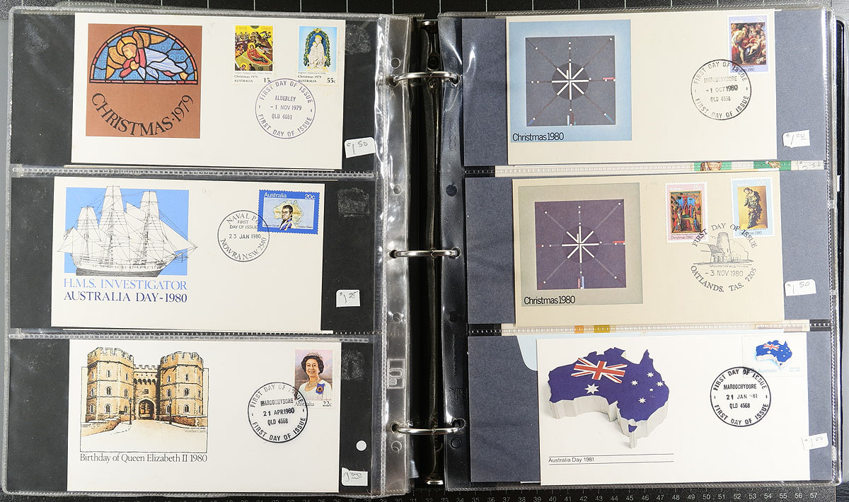 Collection of roughly 375 primarily Australia first day covers, 1970's-2000's, in plastic sleeves housed in three full binders. The lot generally consists of first day covers, some cacheted and some unaddressed, with singles, sets, and souvenir sheet frankings. The collection also includes postal stationery and air letter (both unused and or with first day cancels), along with a few items from Australian Antarctic Territory. A few covers have been priced ranging from $3 to $20 and up each. A nice lot for the Australia collector. Estimate =
