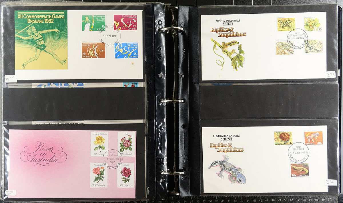 Collection of roughly 375 primarily Australia first day covers, 1970's-2000's, in plastic sleeves housed in three full binders. The lot generally consists of first day covers, some cacheted and some unaddressed, with singles, sets, and souvenir sheet frankings. The collection also includes postal stationery and air letter (both unused and or with first day cancels), along with a few items from Australian Antarctic Territory. A few covers have been priced ranging from $3 to $20 and up each. A nice lot for the Australia collector. Estimate =