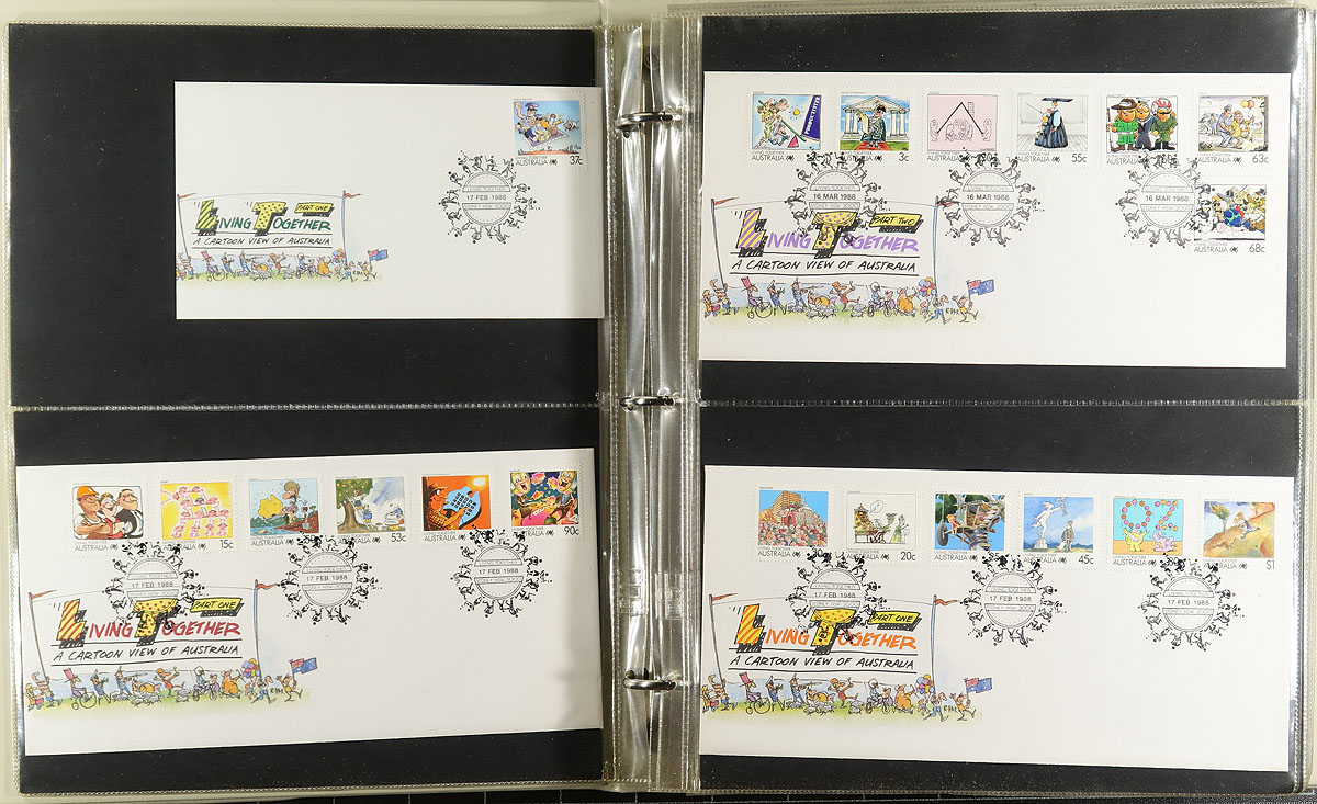 Collection of roughly 375 primarily Australia first day covers, 1970's-2000's, in plastic sleeves housed in three full binders. The lot generally consists of first day covers, some cacheted and some unaddressed, with singles, sets, and souvenir sheet frankings. The collection also includes postal stationery and air letter (both unused and or with first day cancels), along with a few items from Australian Antarctic Territory. A few covers have been priced ranging from $3 to $20 and up each. A nice lot for the Australia collector. Estimate =