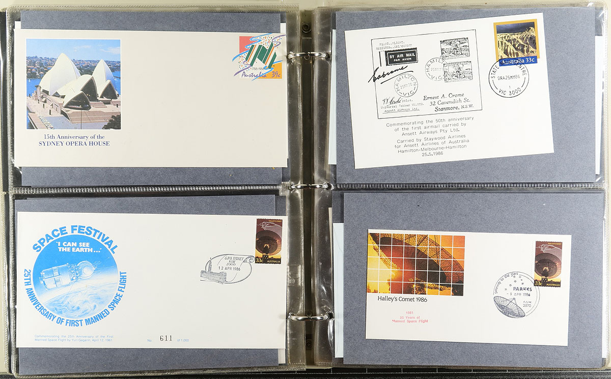 Collection of roughly 375 primarily Australia first day covers, 1970's-2000's, in plastic sleeves housed in three full binders. The lot generally consists of first day covers, some cacheted and some unaddressed, with singles, sets, and souvenir sheet frankings. The collection also includes postal stationery and air letter (both unused and or with first day cancels), along with a few items from Australian Antarctic Territory. A few covers have been priced ranging from $3 to $20 and up each. A nice lot for the Australia collector. Estimate =