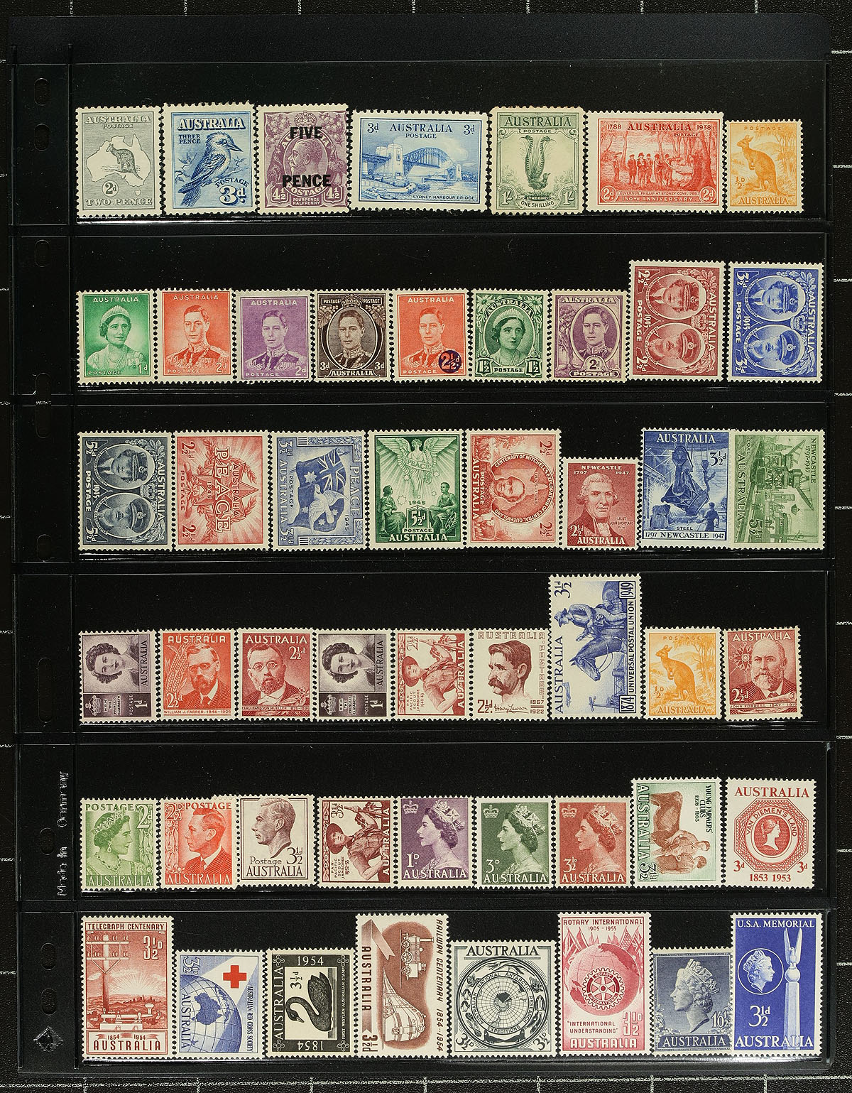 Nice accumulation of primarily never hinged Australia, 1930's-1990's, in a variety of formats. This interesting lot has a bit of everything including singles, sets, blocks, gutter pairs, presentation packs, years sets, in 102 cards, stock pages, album pages, and more. A spot check indicated singles, sets, and partial sets cataloguing $10 to $35 and up each. The lot also includes mint singles and sets from Australian Antarctic Territory. Face value would be a few hundred dollars alone. A nice clean lot for collectors and dealers alike. Estimate =