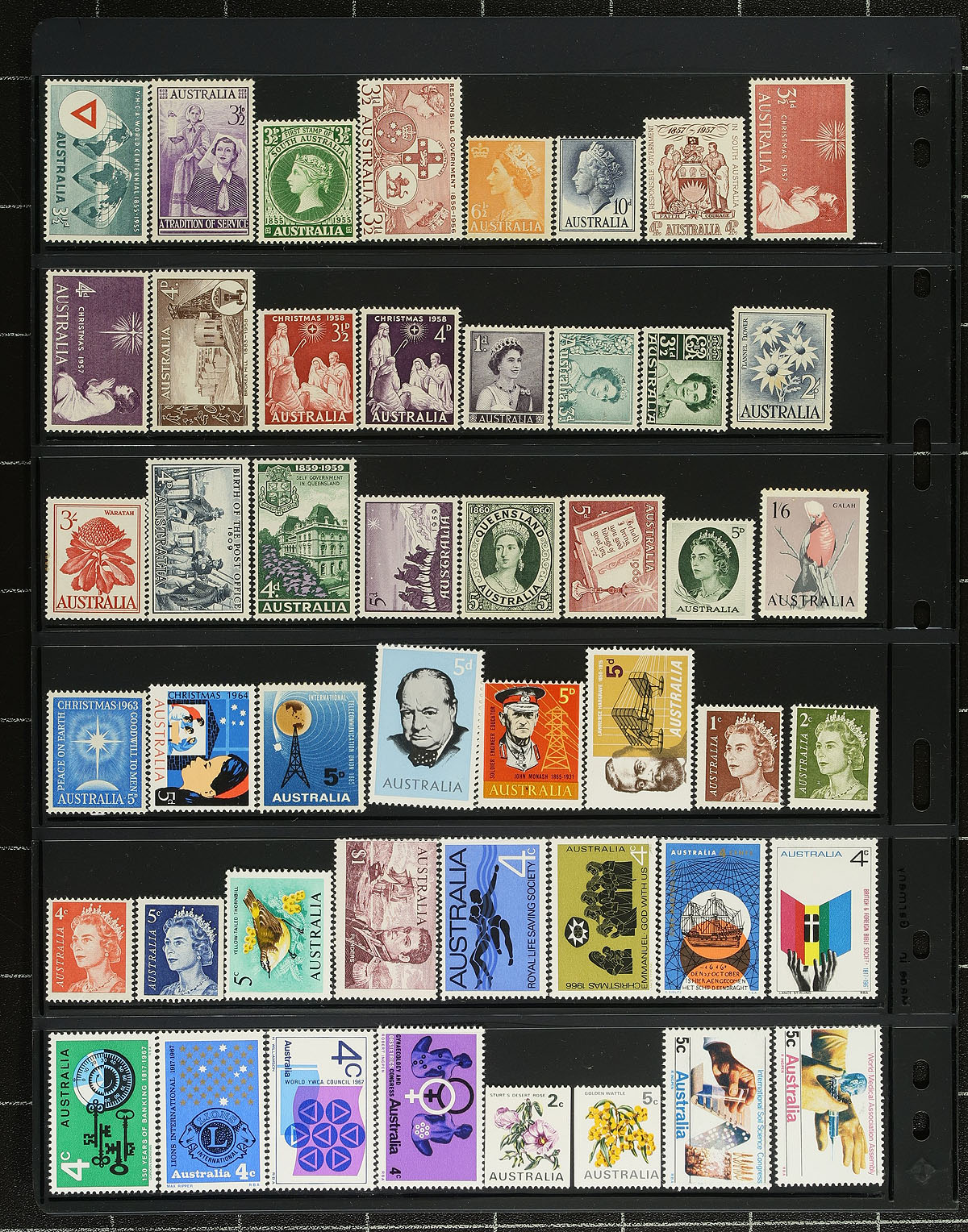 Nice accumulation of primarily never hinged Australia, 1930's-1990's, in a variety of formats. This interesting lot has a bit of everything including singles, sets, blocks, gutter pairs, presentation packs, years sets, in 102 cards, stock pages, album pages, and more. A spot check indicated singles, sets, and partial sets cataloguing $10 to $35 and up each. The lot also includes mint singles and sets from Australian Antarctic Territory. Face value would be a few hundred dollars alone. A nice clean lot for collectors and dealers alike. Estimate =