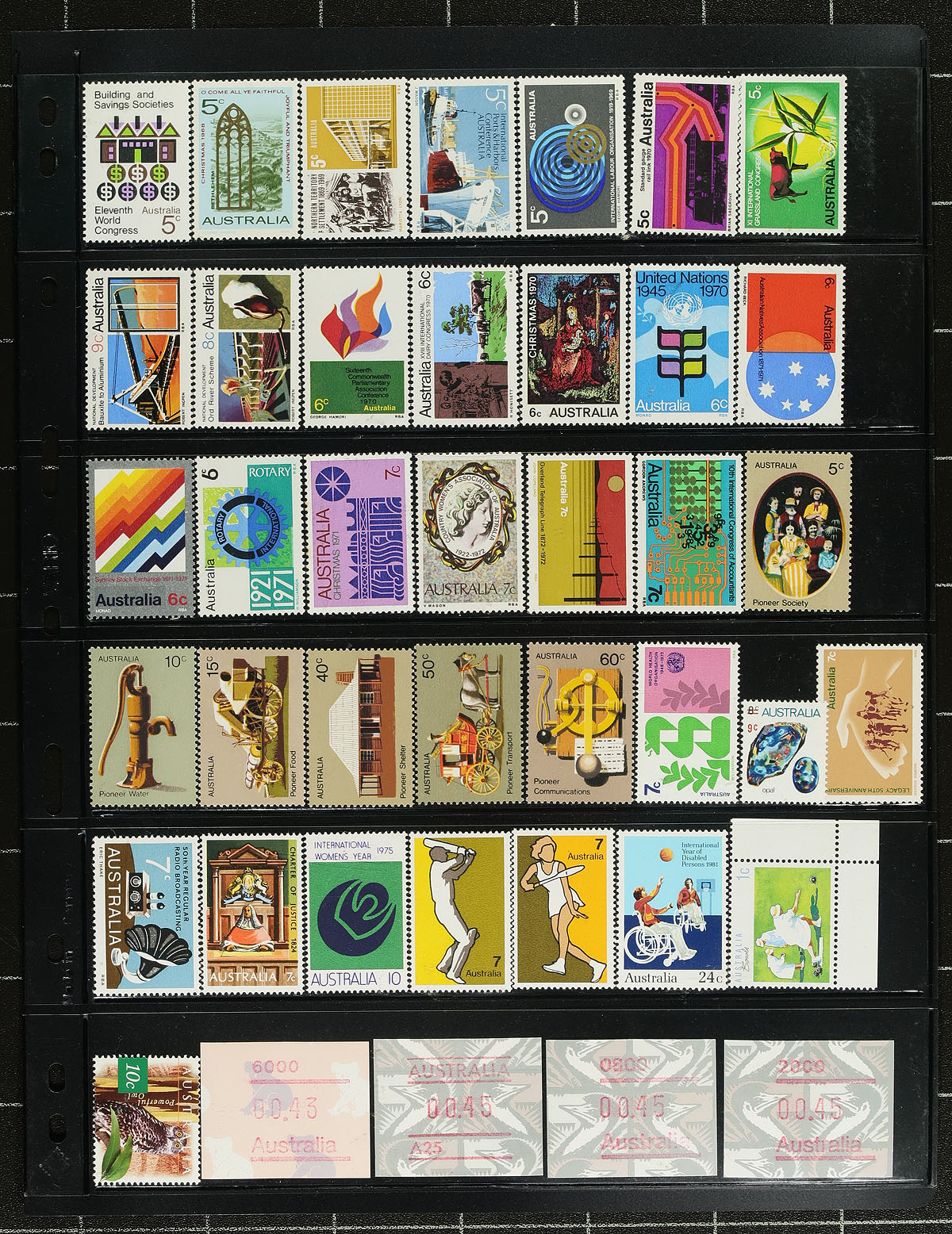 Nice accumulation of primarily never hinged Australia, 1930's-1990's, in a variety of formats. This interesting lot has a bit of everything including singles, sets, blocks, gutter pairs, presentation packs, years sets, in 102 cards, stock pages, album pages, and more. A spot check indicated singles, sets, and partial sets cataloguing $10 to $35 and up each. The lot also includes mint singles and sets from Australian Antarctic Territory. Face value would be a few hundred dollars alone. A nice clean lot for collectors and dealers alike. Estimate =