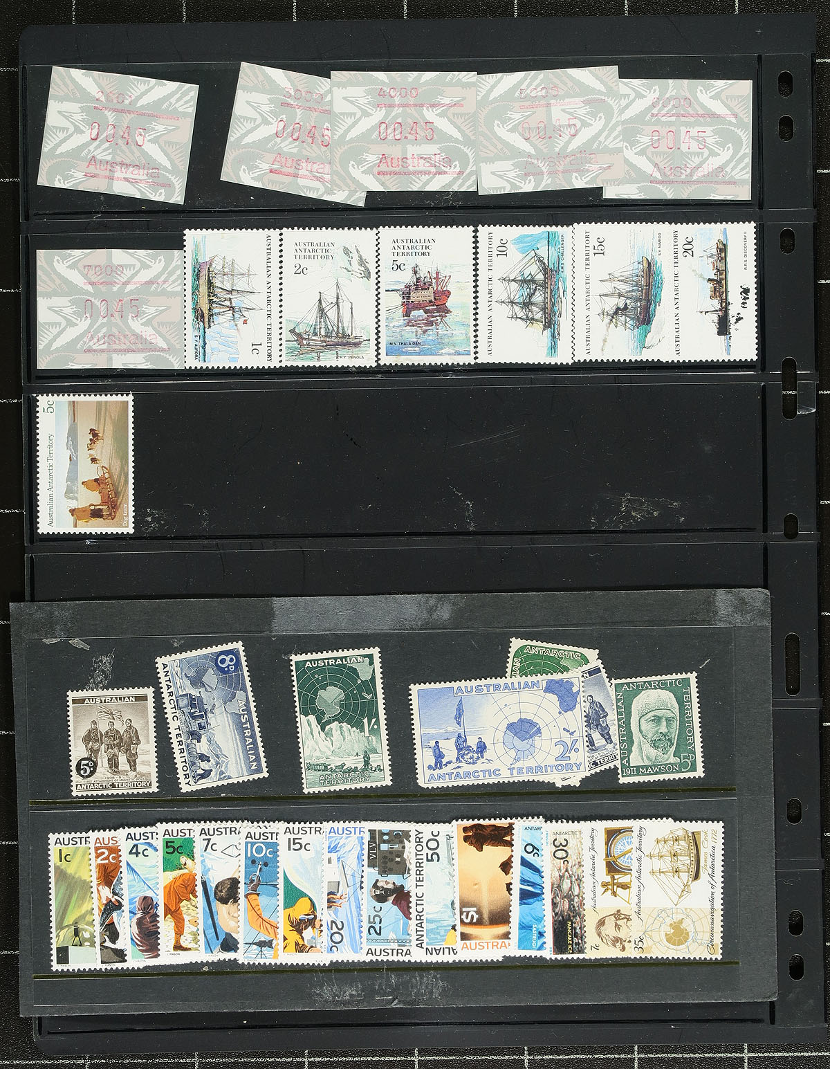 Nice accumulation of primarily never hinged Australia, 1930's-1990's, in a variety of formats. This interesting lot has a bit of everything including singles, sets, blocks, gutter pairs, presentation packs, years sets, in 102 cards, stock pages, album pages, and more. A spot check indicated singles, sets, and partial sets cataloguing $10 to $35 and up each. The lot also includes mint singles and sets from Australian Antarctic Territory. Face value would be a few hundred dollars alone. A nice clean lot for collectors and dealers alike. Estimate =