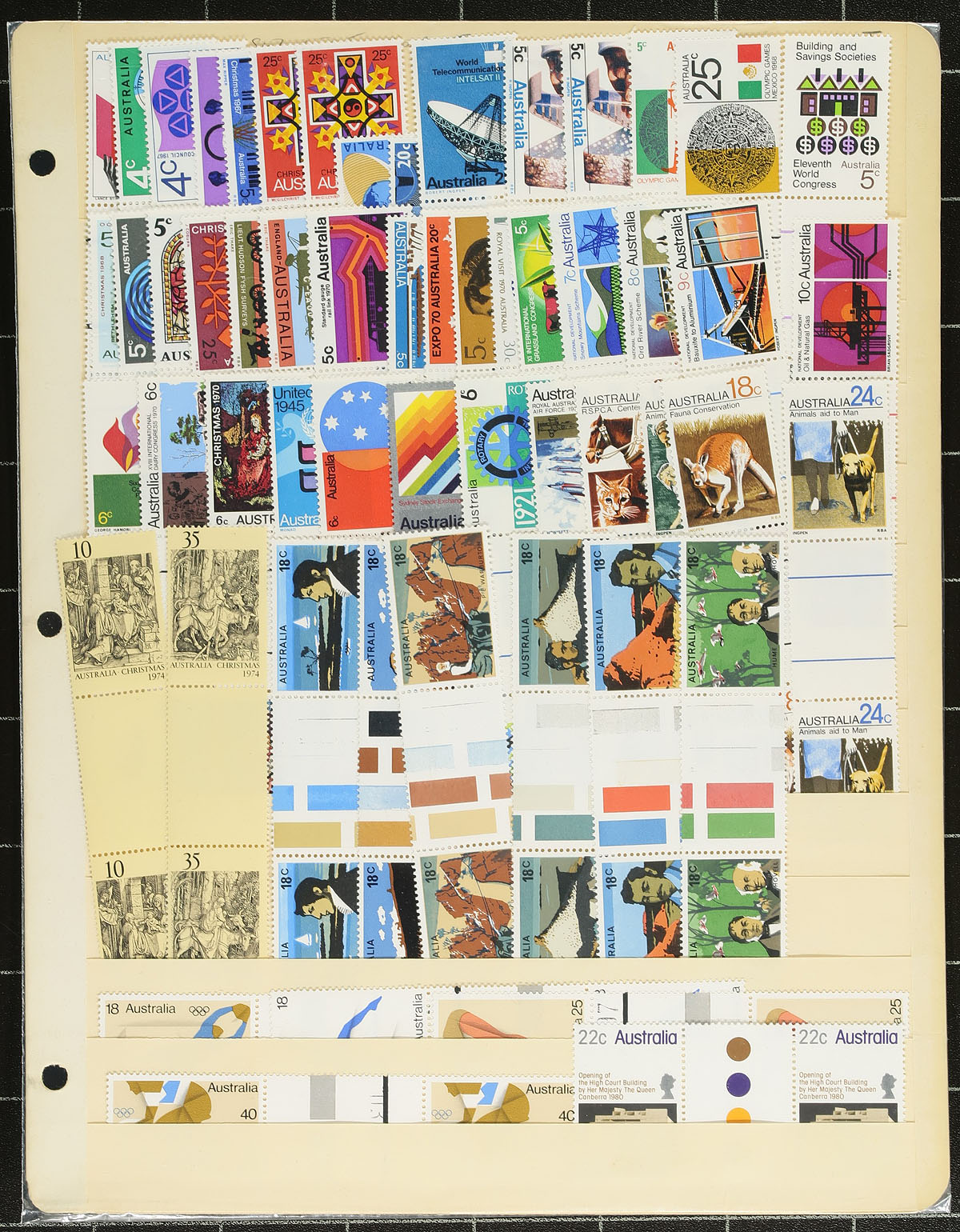Nice accumulation of primarily never hinged Australia, 1930's-1990's, in a variety of formats. This interesting lot has a bit of everything including singles, sets, blocks, gutter pairs, presentation packs, years sets, in 102 cards, stock pages, album pages, and more. A spot check indicated singles, sets, and partial sets cataloguing $10 to $35 and up each. The lot also includes mint singles and sets from Australian Antarctic Territory. Face value would be a few hundred dollars alone. A nice clean lot for collectors and dealers alike. Estimate =