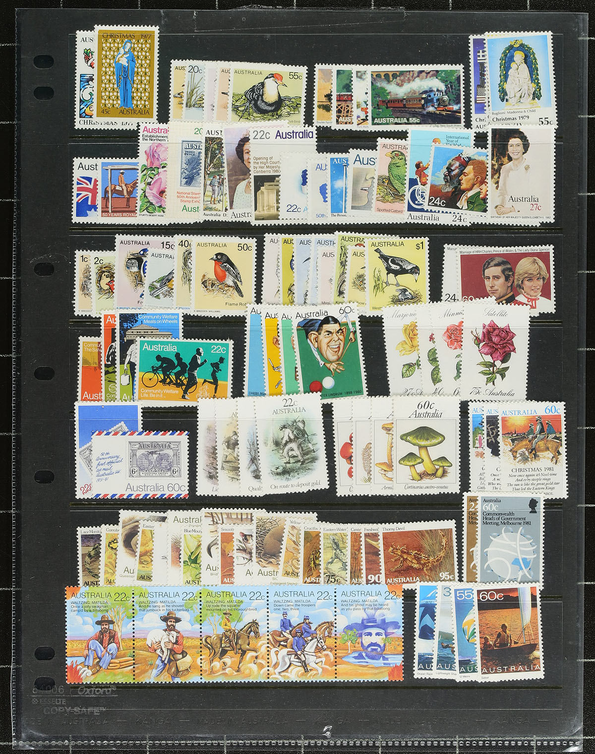 Nice accumulation of primarily never hinged Australia, 1930's-1990's, in a variety of formats. This interesting lot has a bit of everything including singles, sets, blocks, gutter pairs, presentation packs, years sets, in 102 cards, stock pages, album pages, and more. A spot check indicated singles, sets, and partial sets cataloguing $10 to $35 and up each. The lot also includes mint singles and sets from Australian Antarctic Territory. Face value would be a few hundred dollars alone. A nice clean lot for collectors and dealers alike. Estimate =