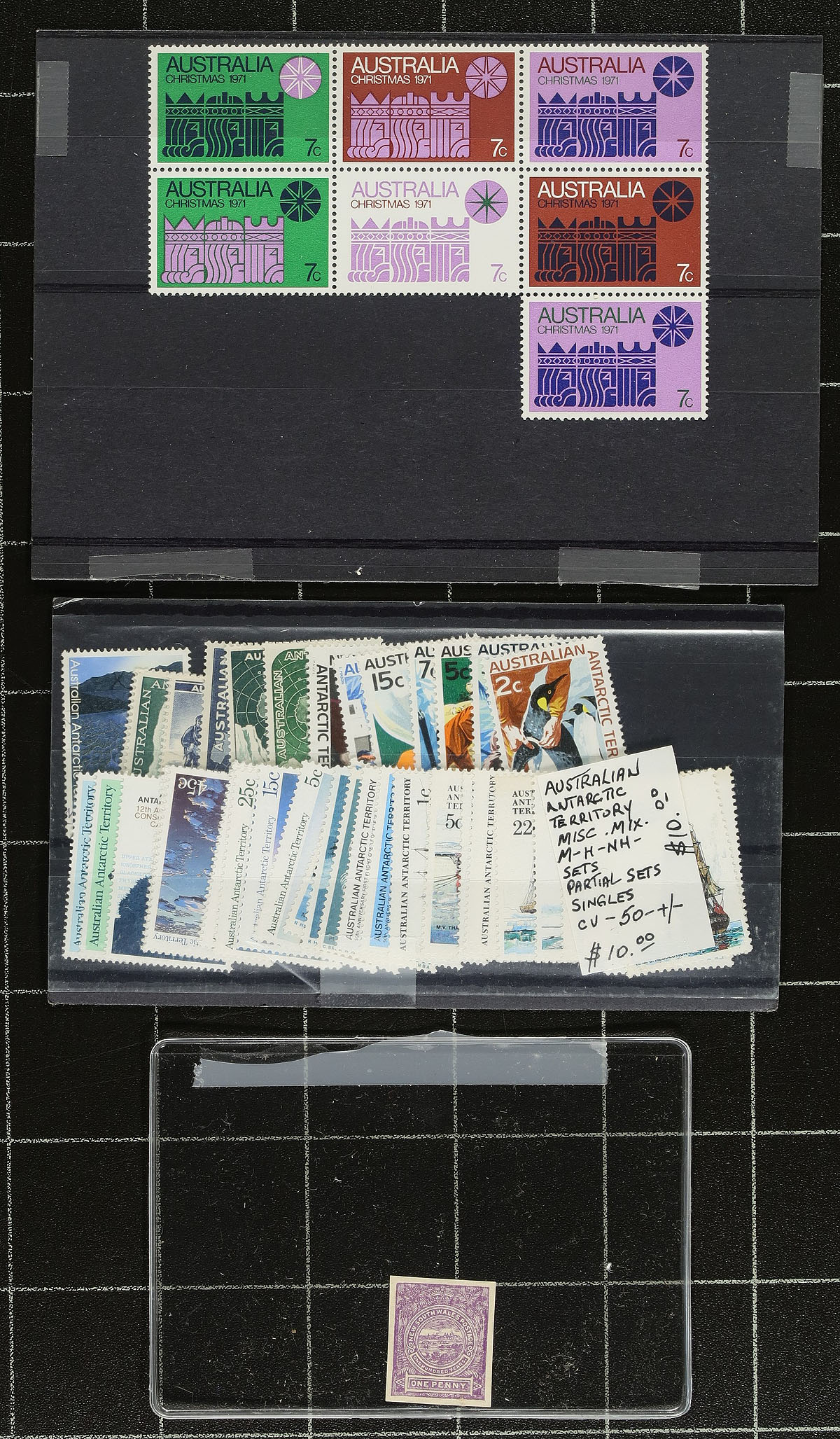 Nice accumulation of primarily never hinged Australia, 1930's-1990's, in a variety of formats. This interesting lot has a bit of everything including singles, sets, blocks, gutter pairs, presentation packs, years sets, in 102 cards, stock pages, album pages, and more. A spot check indicated singles, sets, and partial sets cataloguing $10 to $35 and up each. The lot also includes mint singles and sets from Australian Antarctic Territory. Face value would be a few hundred dollars alone. A nice clean lot for collectors and dealers alike. Estimate =