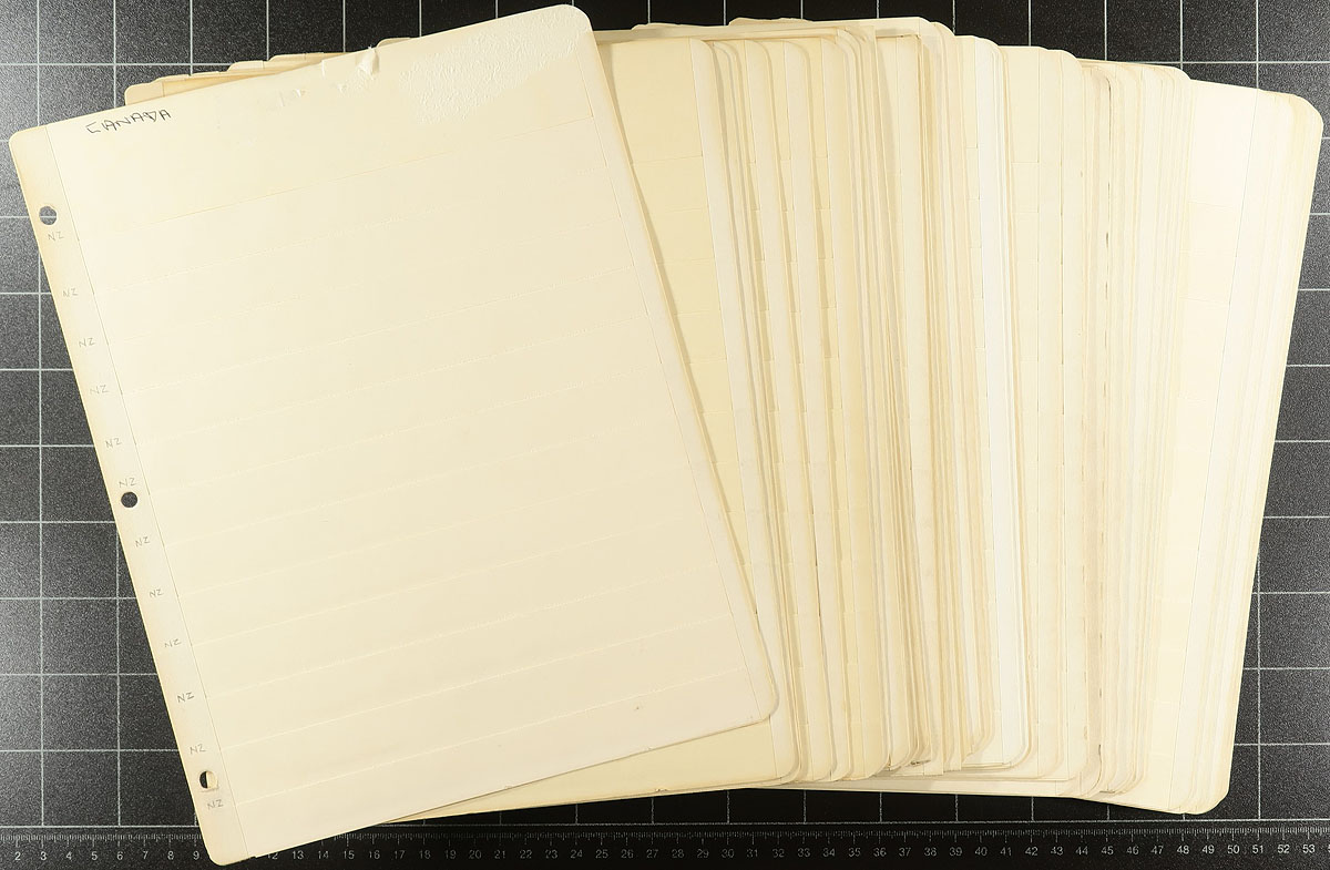 Group of 125 manila pages, gently used with a header in pen, and a few pencil notations per page. Still a very useful lot for all collectors with lots of life left in them. Estimate =