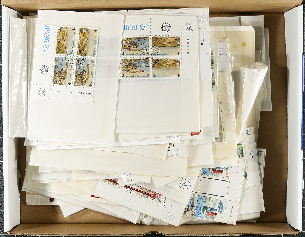 Nice collection / accumulation of few thousand used Isle of Man, 1976-1993, all with CTO cancels, ranging from Scott #86/561, noting mostly sets, many large blocks and souvenir sheets. A clean lot as almost every item is in original packaging (probably from the philatelic services), ideal for the Commonwealth, thematic, or topical collector. Owner's older 2013 Scott US$1,885.00 =