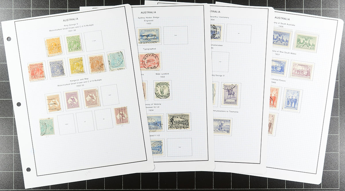 Accumulation of used Australia and a few States, 1890's-1990's, with roughly 1,000 stamps in a variety of formats including album pages, 102 cards, stock pages and more. A spot check indicated the majority of material ranges from the 1900's to the 1950's, including officials and other "back of the book" material, varieties, a few Kangaroos, KGV Heads, and more. We note some singles ranging from $10 to $15 each, leaving potential finds to the dedicated collector, including better postmarks. A good lot for the Australia or worldwide used collector, overall fine to very fine. Estimate =