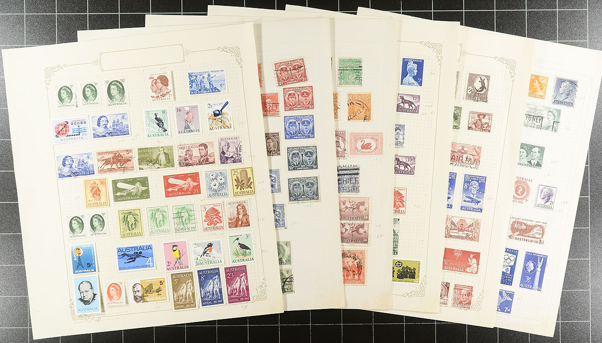 Accumulation of used Australia and a few States, 1890's-1990's, with roughly 1,000 stamps in a variety of formats including album pages, 102 cards, stock pages and more. A spot check indicated the majority of material ranges from the 1900's to the 1950's, including officials and other "back of the book" material, varieties, a few Kangaroos, KGV Heads, and more. We note some singles ranging from $10 to $15 each, leaving potential finds to the dedicated collector, including better postmarks. A good lot for the Australia or worldwide used collector, overall fine to very fine. Estimate =