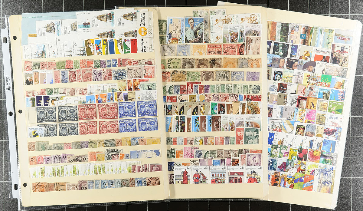Accumulation of used Australia and a few States, 1890's-1990's, with roughly 1,000 stamps in a variety of formats including album pages, 102 cards, stock pages and more. A spot check indicated the majority of material ranges from the 1900's to the 1950's, including officials and other "back of the book" material, varieties, a few Kangaroos, KGV Heads, and more. We note some singles ranging from $10 to $15 each, leaving potential finds to the dedicated collector, including better postmarks. A good lot for the Australia or worldwide used collector, overall fine to very fine. Estimate =