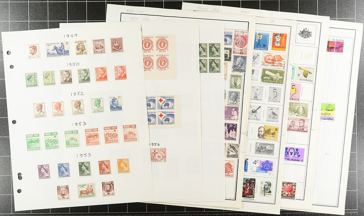 Accumulation of used Australia and a few States, 1890's-1990's, with roughly 1,000 stamps in a variety of formats including album pages, 102 cards, stock pages and more. A spot check indicated the majority of material ranges from the 1900's to the 1950's, including officials and other "back of the book" material, varieties, a few Kangaroos, KGV Heads, and more. We note some singles ranging from $10 to $15 each, leaving potential finds to the dedicated collector, including better postmarks. A good lot for the Australia or worldwide used collector, overall fine to very fine. Estimate =