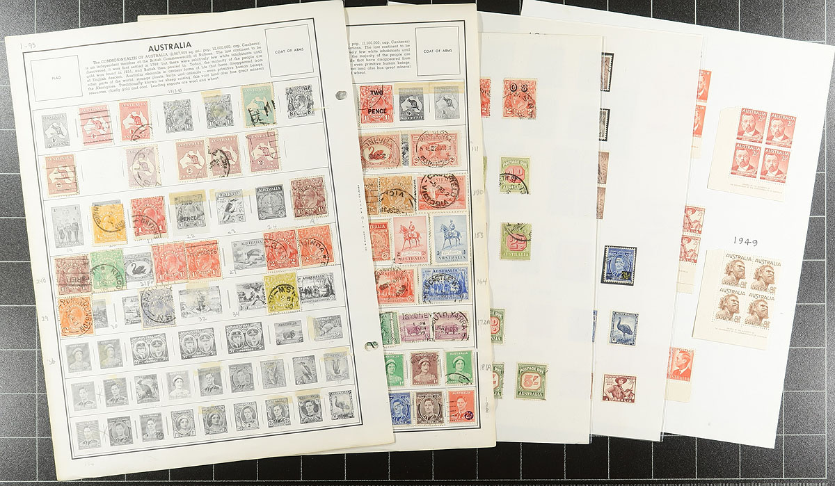 Accumulation of used Australia and a few States, 1890's-1990's, with roughly 1,000 stamps in a variety of formats including album pages, 102 cards, stock pages and more. A spot check indicated the majority of material ranges from the 1900's to the 1950's, including officials and other "back of the book" material, varieties, a few Kangaroos, KGV Heads, and more. We note some singles ranging from $10 to $15 each, leaving potential finds to the dedicated collector, including better postmarks. A good lot for the Australia or worldwide used collector, overall fine to very fine. Estimate =
