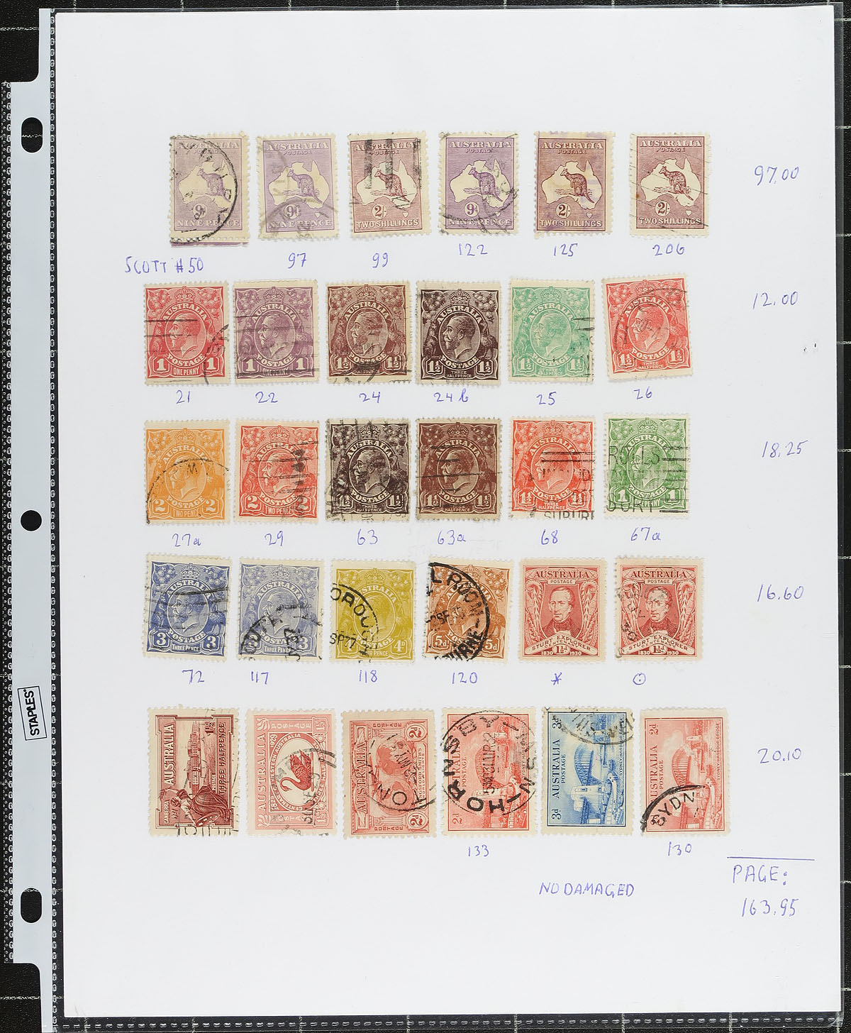 Accumulation of used Australia and a few States, 1890's-1990's, with roughly 1,000 stamps in a variety of formats including album pages, 102 cards, stock pages and more. A spot check indicated the majority of material ranges from the 1900's to the 1950's, including officials and other "back of the book" material, varieties, a few Kangaroos, KGV Heads, and more. We note some singles ranging from $10 to $15 each, leaving potential finds to the dedicated collector, including better postmarks. A good lot for the Australia or worldwide used collector, overall fine to very fine. Estimate =