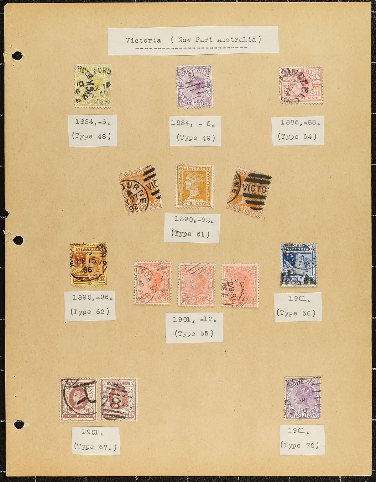 Accumulation of used Australia and a few States, 1890's-1990's, with roughly 1,000 stamps in a variety of formats including album pages, 102 cards, stock pages and more. A spot check indicated the majority of material ranges from the 1900's to the 1950's, including officials and other "back of the book" material, varieties, a few Kangaroos, KGV Heads, and more. We note some singles ranging from $10 to $15 each, leaving potential finds to the dedicated collector, including better postmarks. A good lot for the Australia or worldwide used collector, overall fine to very fine. Estimate =