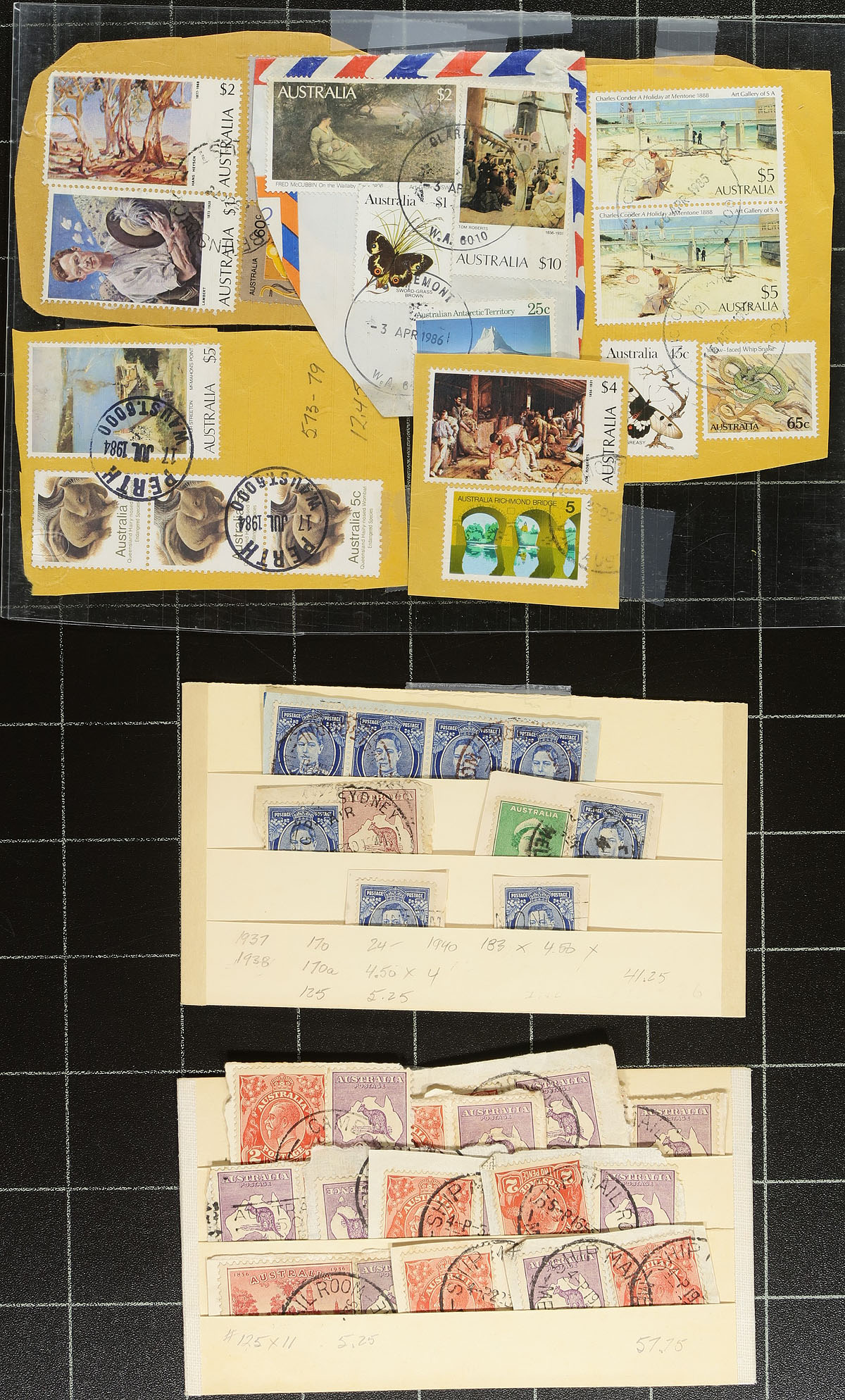 Accumulation of used Australia and a few States, 1890's-1990's, with roughly 1,000 stamps in a variety of formats including album pages, 102 cards, stock pages and more. A spot check indicated the majority of material ranges from the 1900's to the 1950's, including officials and other "back of the book" material, varieties, a few Kangaroos, KGV Heads, and more. We note some singles ranging from $10 to $15 each, leaving potential finds to the dedicated collector, including better postmarks. A good lot for the Australia or worldwide used collector, overall fine to very fine. Estimate =