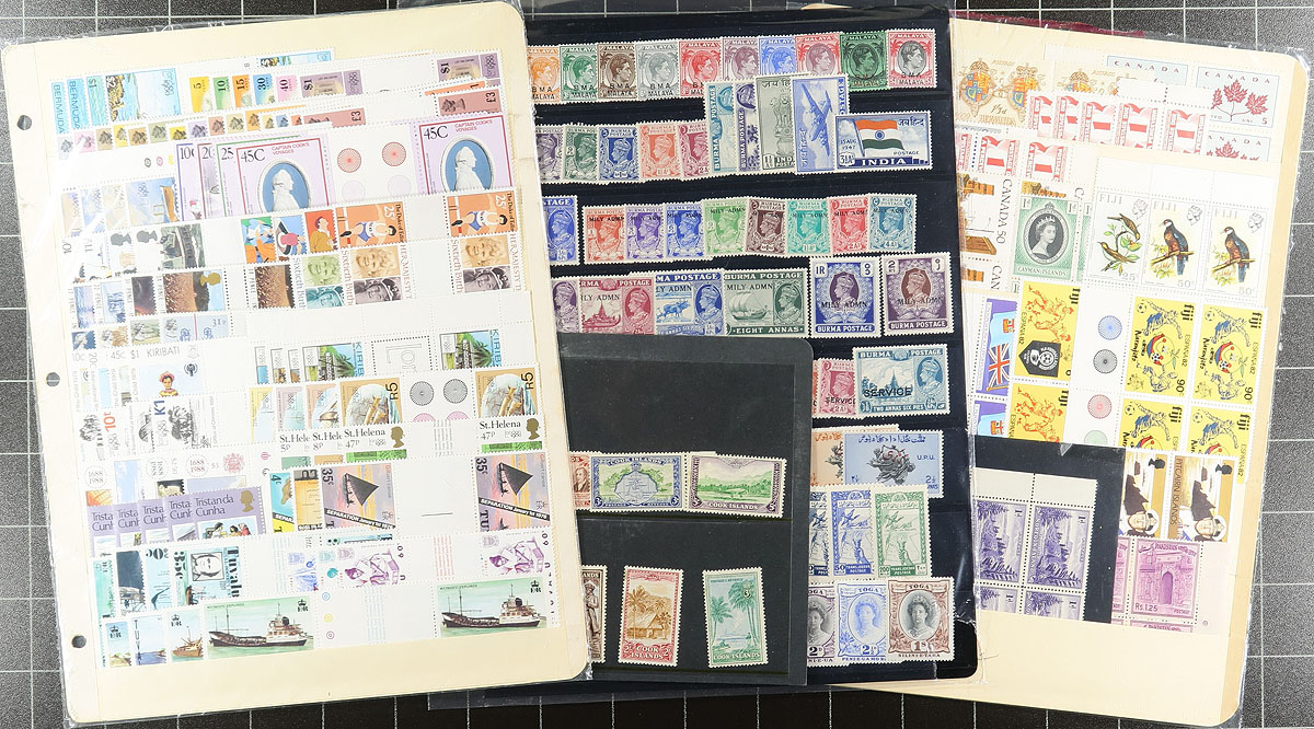 Group of mint British Commonwealth singles and sets, containing many hundreds of stamps in several stock pages. The stamps generally range from KGVI reign onwards, noting gutter pairs, a few booklets and souvenir sheets, along with many sets and partial sets. A spot check indicated better representation from British West Indies, with some material cataloguing $10 and up, and a mix of never hinged and hinge stamps. A nice lot for all collectors. Estimate =