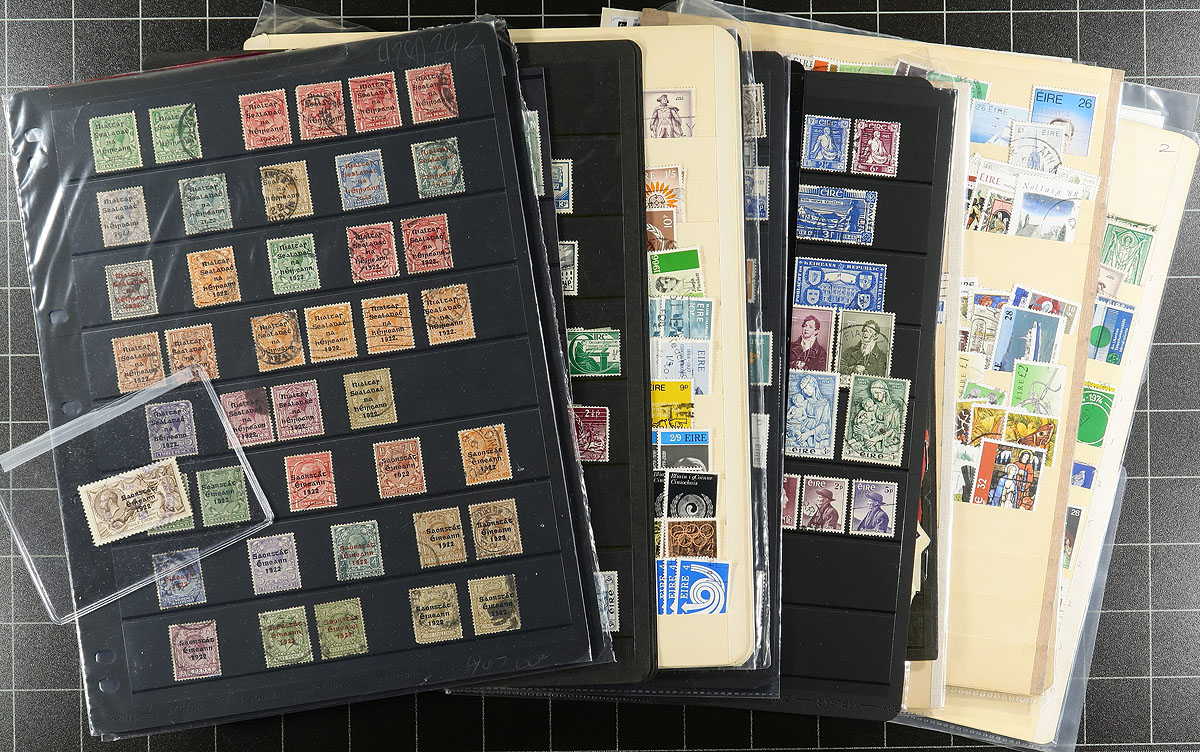 Large accumulation of used Ireland, 1922-2013, containing roughly 2,500 stamps in over 20 stock or manila pages. The lot generally ranges from Scott #5/1984, containing a small grouping of 1922-1925 overprints, along with a decent amount of modern used, and a few "back of the book" issues. A spot check indicated a few singles, sets, and partial sets cataloguing $10 to $30 each, including #77 (c.v. $132). Owner's older Scott catalogue value in excess of $1,500, leaving better finds, including town postmarks, to dedicated collectors. Overall fine to very fine. Estimate =