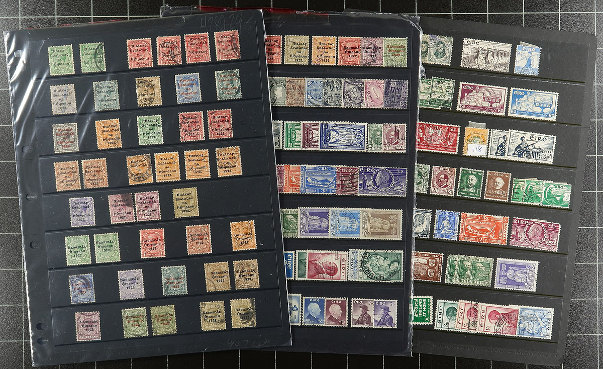 Large accumulation of used Ireland, 1922-2013, containing roughly 2,500 stamps in over 20 stock or manila pages. The lot generally ranges from Scott #5/1984, containing a small grouping of 1922-1925 overprints, along with a decent amount of modern used, and a few "back of the book" issues. A spot check indicated a few singles, sets, and partial sets cataloguing $10 to $30 each, including #77 (c.v. $132). Owner's older Scott catalogue value in excess of $1,500, leaving better finds, including town postmarks, to dedicated collectors. Overall fine to very fine. Estimate =