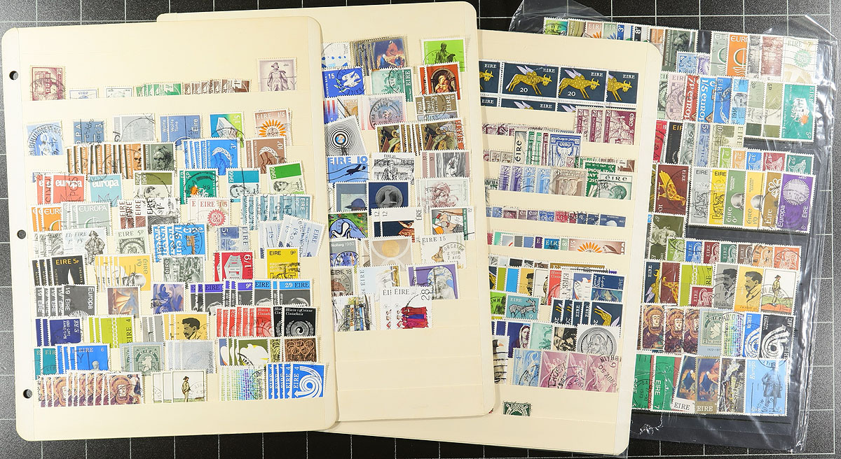 Large accumulation of used Ireland, 1922-2013, containing roughly 2,500 stamps in over 20 stock or manila pages. The lot generally ranges from Scott #5/1984, containing a small grouping of 1922-1925 overprints, along with a decent amount of modern used, and a few "back of the book" issues. A spot check indicated a few singles, sets, and partial sets cataloguing $10 to $30 each, including #77 (c.v. $132). Owner's older Scott catalogue value in excess of $1,500, leaving better finds, including town postmarks, to dedicated collectors. Overall fine to very fine. Estimate =