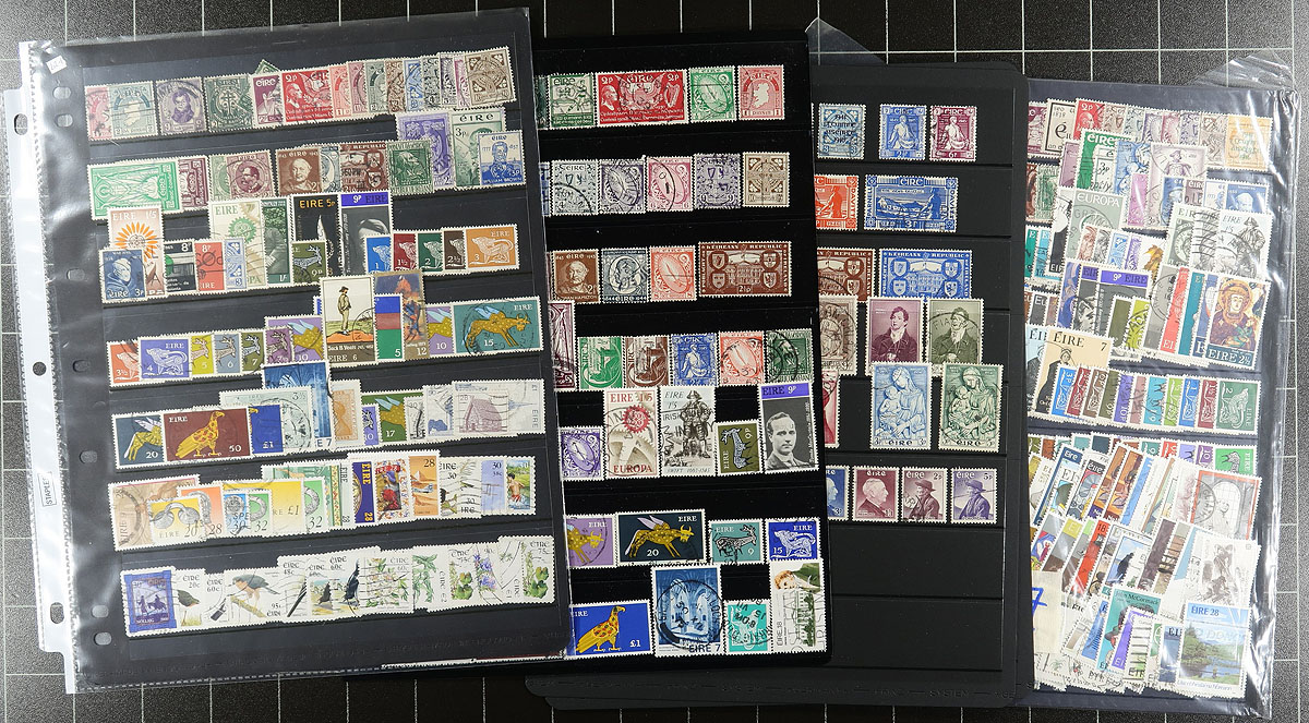 Large accumulation of used Ireland, 1922-2013, containing roughly 2,500 stamps in over 20 stock or manila pages. The lot generally ranges from Scott #5/1984, containing a small grouping of 1922-1925 overprints, along with a decent amount of modern used, and a few "back of the book" issues. A spot check indicated a few singles, sets, and partial sets cataloguing $10 to $30 each, including #77 (c.v. $132). Owner's older Scott catalogue value in excess of $1,500, leaving better finds, including town postmarks, to dedicated collectors. Overall fine to very fine. Estimate =