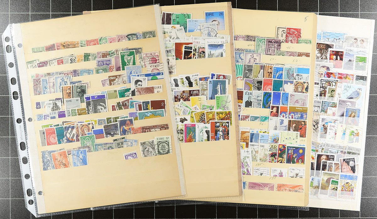 Large accumulation of used Ireland, 1922-2013, containing roughly 2,500 stamps in over 20 stock or manila pages. The lot generally ranges from Scott #5/1984, containing a small grouping of 1922-1925 overprints, along with a decent amount of modern used, and a few "back of the book" issues. A spot check indicated a few singles, sets, and partial sets cataloguing $10 to $30 each, including #77 (c.v. $132). Owner's older Scott catalogue value in excess of $1,500, leaving better finds, including town postmarks, to dedicated collectors. Overall fine to very fine. Estimate =