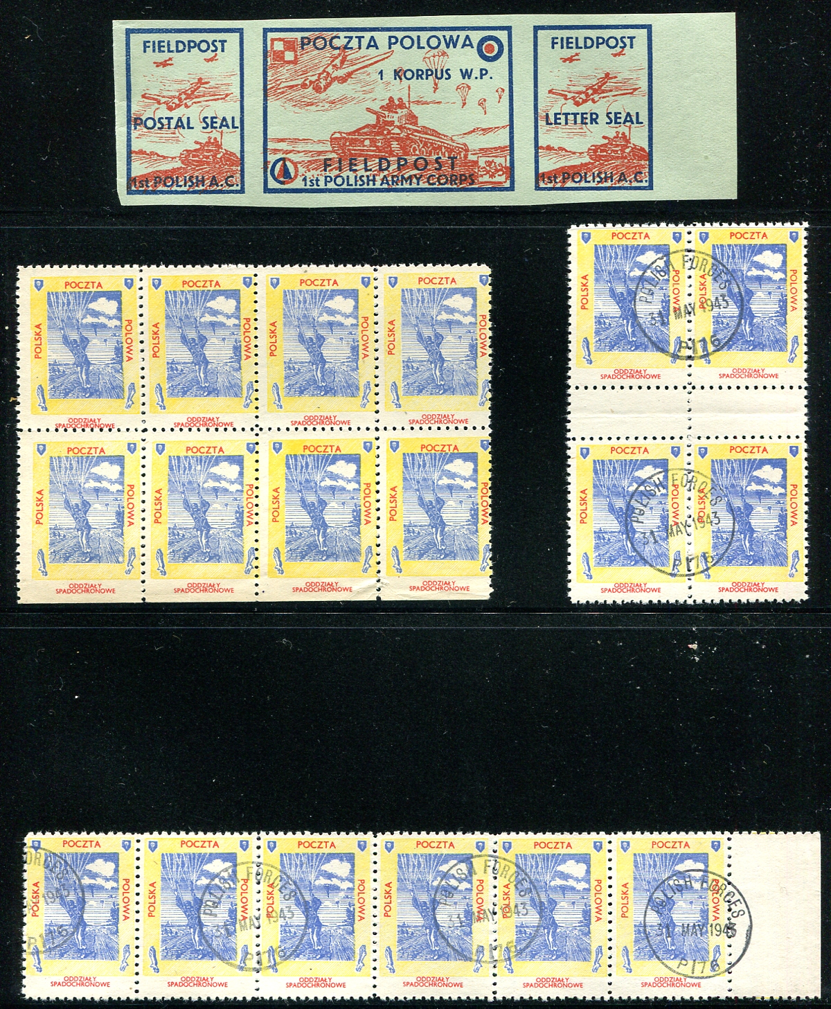 Polish Government in Exile. Nice group of Poland government in exile 1942-1943, range of 21 mint and used postal seals produced by the Polish forces in Great Britain. Includes first Polish Army Corps never hinged in red and blue (only 1,080 strips issued); first Polish Paratroop label (9,600 issues), block of 8 never hinged, strip of 6 used, and gutter block used (used appearing to be CTO cancels). A scarce and interesting group for the cinderella or military collector. Estimate =