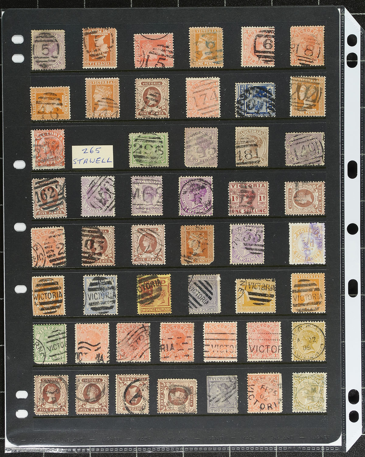 Victoria Postmarks Part A. Collection of postmarks from Victoria State, Australia, 1890's-1970's, containing a few hundred stamps (on and off piece), and roughly 60 covers housed in a thick binder. The lot is organized alphabetically containing over 100 different town postmarks ranging from A to Melbourne (represented by at least one stamp), noting several Victorian State stamps, with the majority of material ranging from the 1890's up to the 1950's. Just a few towns include Boolara, Bacchus March, Coopers Creek, Clifton Hill, Kilcunda, and more, noting cds, duplex, and other postmark types. The lot includes maps of all the locations and towns within the collection. An interesting lot for the specialist, with online photos showing a small sampling. Estimate =
