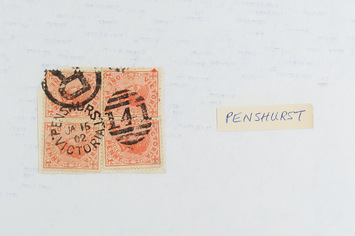 Victoria Postmarks Part B. Collection of postmarks from Victoria State, Australia, 1890's-1970's, containing a few hundred stamps (on and off piece), and a handful of covers in a thick binder. The lot is organized alphabetically containing over 85 different town postmarks ranging from Melton to Y (represented by at least one stamp), noting several Victorian State stamps, with the majority of material ranging from the 1890's to the 1950's. Just a few towns include Minyip, Moonee Ponds, Reedy Creek, Woomelang, Yackandawdah, and more. The lot includes maps of all the locations and towns within the collection. An interesting lot for the specialist, with online photos showing a small sampling. Estimate =
