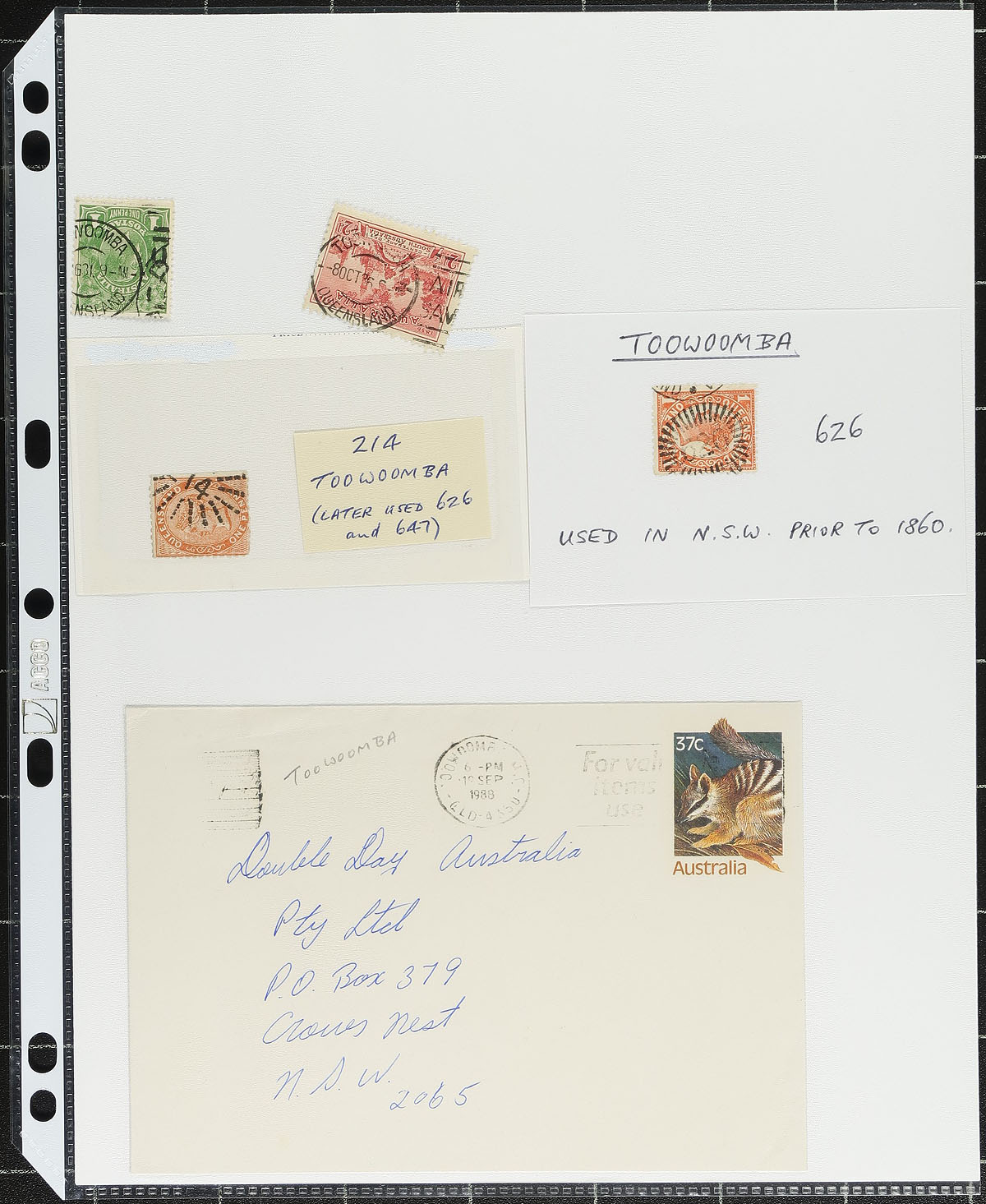 Queensland Postmarks. Collection of postmarks from Queensland State, Australia, 1890's-1970's, containing a few hundred stamps (on and off piece), and roughly 70 covers housed in a thick binder. The lot is organized alphabetically containing over 110 different town postmarks ranging from A to Y (represented by at least one stamp), noting several Queensland State stamps, with the majority of material ranging from the 1890's up to the 1950's. Just a few towns include Bandamba, Dirranbandi, Goondiwindi, Indooroopilly, Lockhart River, Toogoolawah, and more, noting cds, duplex, numeral, and other postmark types. The lot includes maps of all the locations and towns within the collection. An interesting lot for the specialist, with online photos showing a small sampling. Estimate =