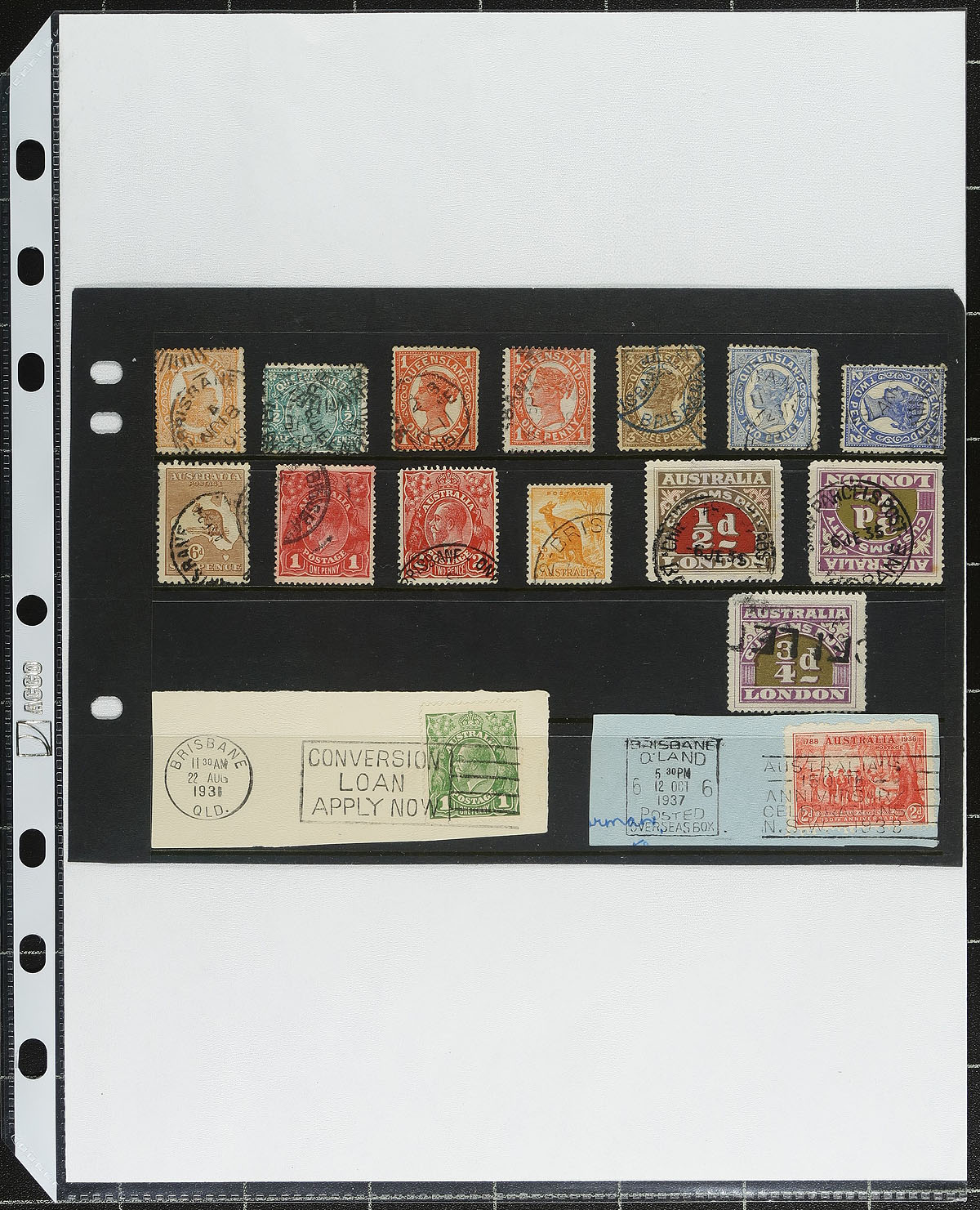 Queensland Postmarks. Collection of postmarks from Queensland State, Australia, 1890's-1970's, containing a few hundred stamps (on and off piece), and roughly 70 covers housed in a thick binder. The lot is organized alphabetically containing over 110 different town postmarks ranging from A to Y (represented by at least one stamp), noting several Queensland State stamps, with the majority of material ranging from the 1890's up to the 1950's. Just a few towns include Bandamba, Dirranbandi, Goondiwindi, Indooroopilly, Lockhart River, Toogoolawah, and more, noting cds, duplex, numeral, and other postmark types. The lot includes maps of all the locations and towns within the collection. An interesting lot for the specialist, with online photos showing a small sampling. Estimate =