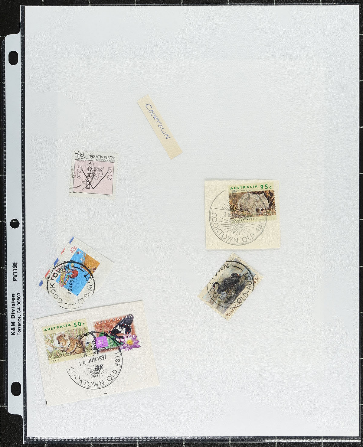 Queensland Postmarks. Collection of postmarks from Queensland State, Australia, 1890's-1970's, containing a few hundred stamps (on and off piece), and roughly 70 covers housed in a thick binder. The lot is organized alphabetically containing over 110 different town postmarks ranging from A to Y (represented by at least one stamp), noting several Queensland State stamps, with the majority of material ranging from the 1890's up to the 1950's. Just a few towns include Bandamba, Dirranbandi, Goondiwindi, Indooroopilly, Lockhart River, Toogoolawah, and more, noting cds, duplex, numeral, and other postmark types. The lot includes maps of all the locations and towns within the collection. An interesting lot for the specialist, with online photos showing a small sampling. Estimate =