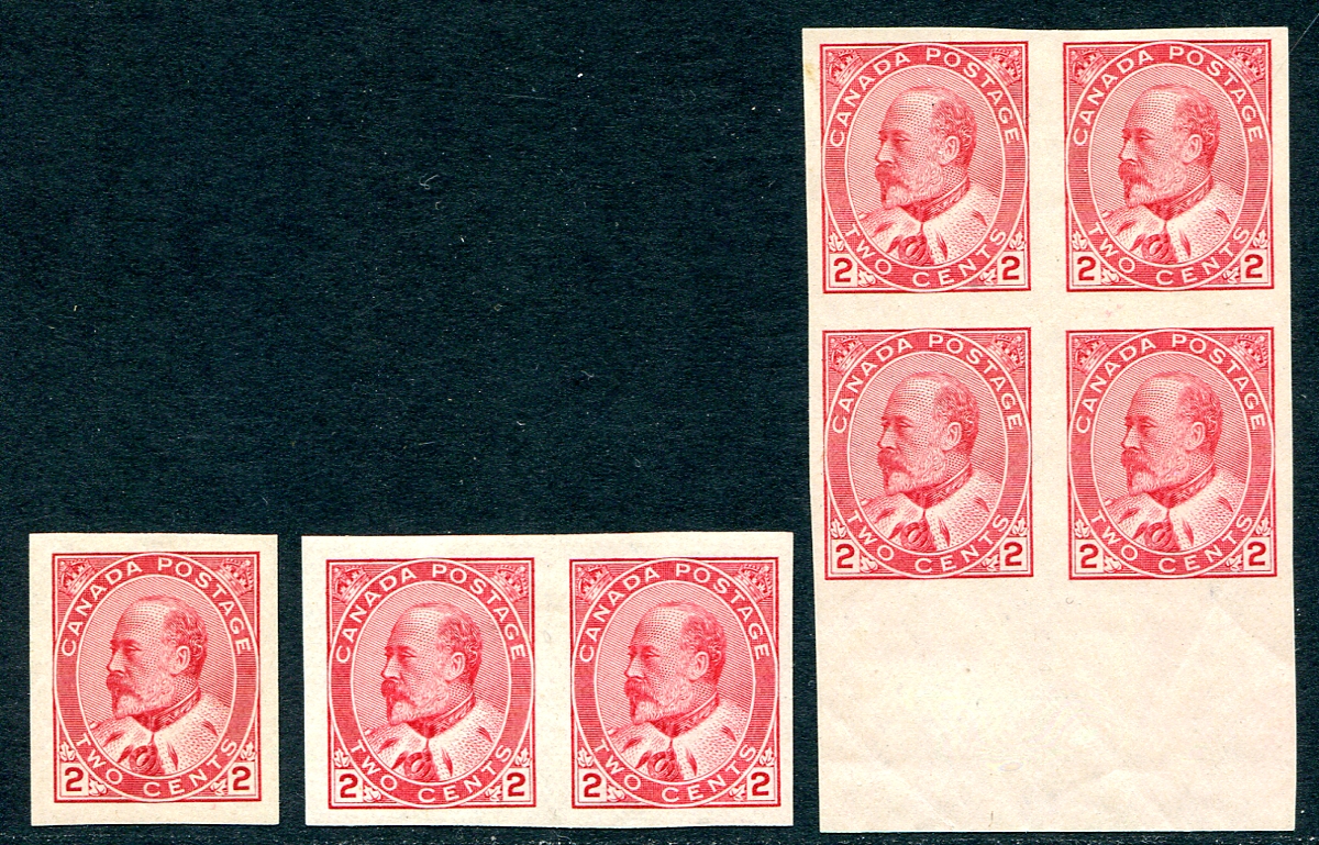 VF mint single, pair and sheet-margin block of the 1903 2c Edward (die II). A premium group of examples of this publicly issued imperforate. The single is NH, pair LH and block with LH top, NH bottom. 2025 Scott US$400.00 =