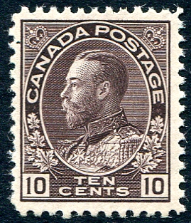 Fresh and Fine mint Never Hinged example of the 1912 issue 10c plum KGV Admiral. One of the key early Admirals. A well above-average example of this tough stamp. 2025 Scott US$700.00 =