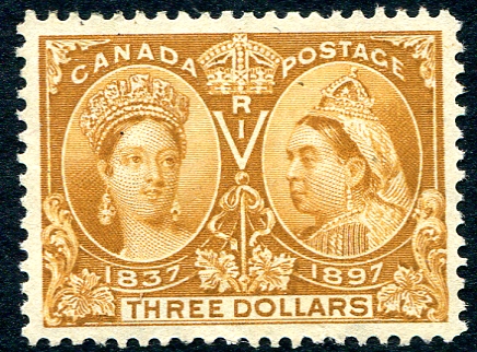 VF centered unused (no gum) example of the $3.00 yellow bister 1897 QV Diamond Jubilee issue. Very minor perf thin lower right, mentioned for the record. A nice stamp with strong colour, a high-value Canadian Classic. 2025 Scott US$1300.00 =