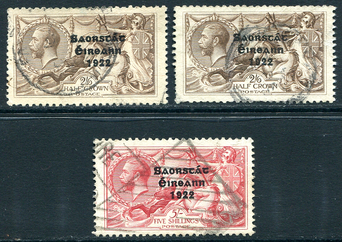 Trio of used Irish overprinted "Seahorses" including the 1925 issued 2sh6p gray brown and 5sh rose red, along with the later 1927-1928 "Wide 1922" 2sh6p value (the latter with a few shorter perfs, mentioned for the record). Attractive copies with reasonable postmarks for this issue. 2025 Scott US$510.00 =