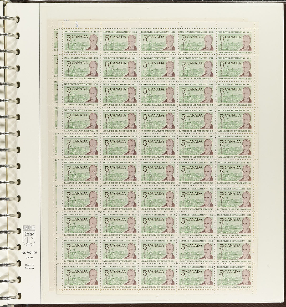 Mint Sheet Holding Part 1. An old-time mint sheet holding with 72 complete NH sheets ranging from the 1947 "Citizenship" issue up to the 1968 "Voyage of the Nonsuch" (#275/482). Primarily in sheets of 50, with a few sheets of 100 including a Winnipeg Tagged 5c QEII Centennial sheet (458p). Most are philatelic stock, with inscription blocks. Some minor duplication, but with some of the duplicates being selected for either different pane positions / different plate numbers. An old-time holding, totally unchecked for better paper types which occur regularly during this period. All neatly housed within a hingleless Linder album, with slipcase. Valued for the total face value alone, but certainly worth more as complete sheets. Total face value =